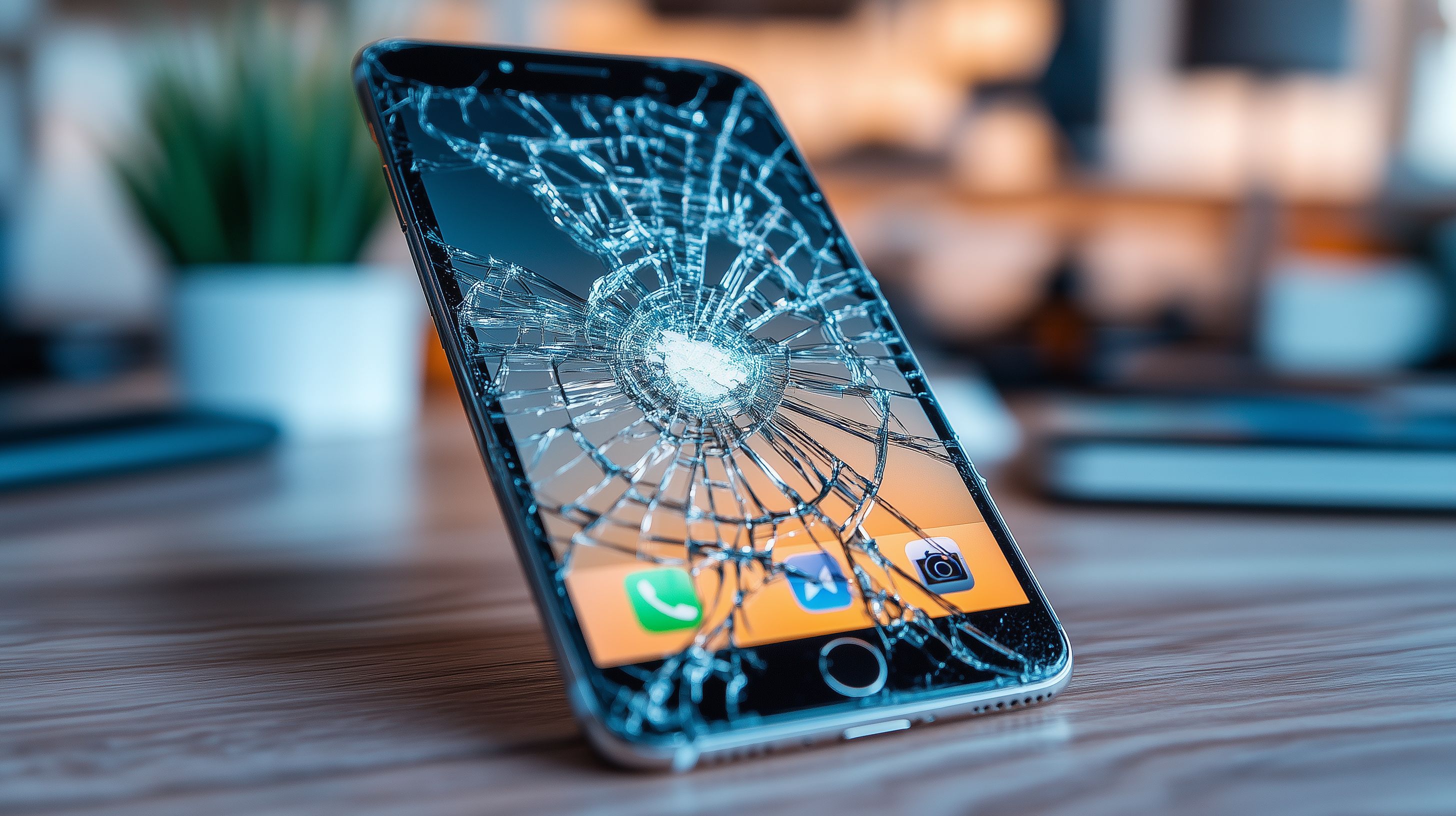 Das Foto zeigt ein zerbrochenes Smartphone-Display auf einem hölzernen Bürotisch. Das Smartphone liegt verkratzt und mit einem großen Riss in der Mitte der Bildschirmoberfläche da, was auf einen Materialschaden oder Sturz hindeutet. Das Bild vermittelt ein Gefühl von Ärger und Frust, aber auch von Verlust und den Ärger über einen kaputten Technologiegegenstand. Dieses Foto eignet sich hervorragend für Beiträge zum Thema Technik, Reparatur, Gefahren für Smartphones und Handhygiene. Es kann in Blogbeiträgen, Werbekampagnen, Social-Media-Inhalten oder Newslettern verwendet werden. Als hochaufgelöstes, kostenloses Stockfoto unter der Creative-Commons-Lizenz ist es vielseitig einsetzbar.