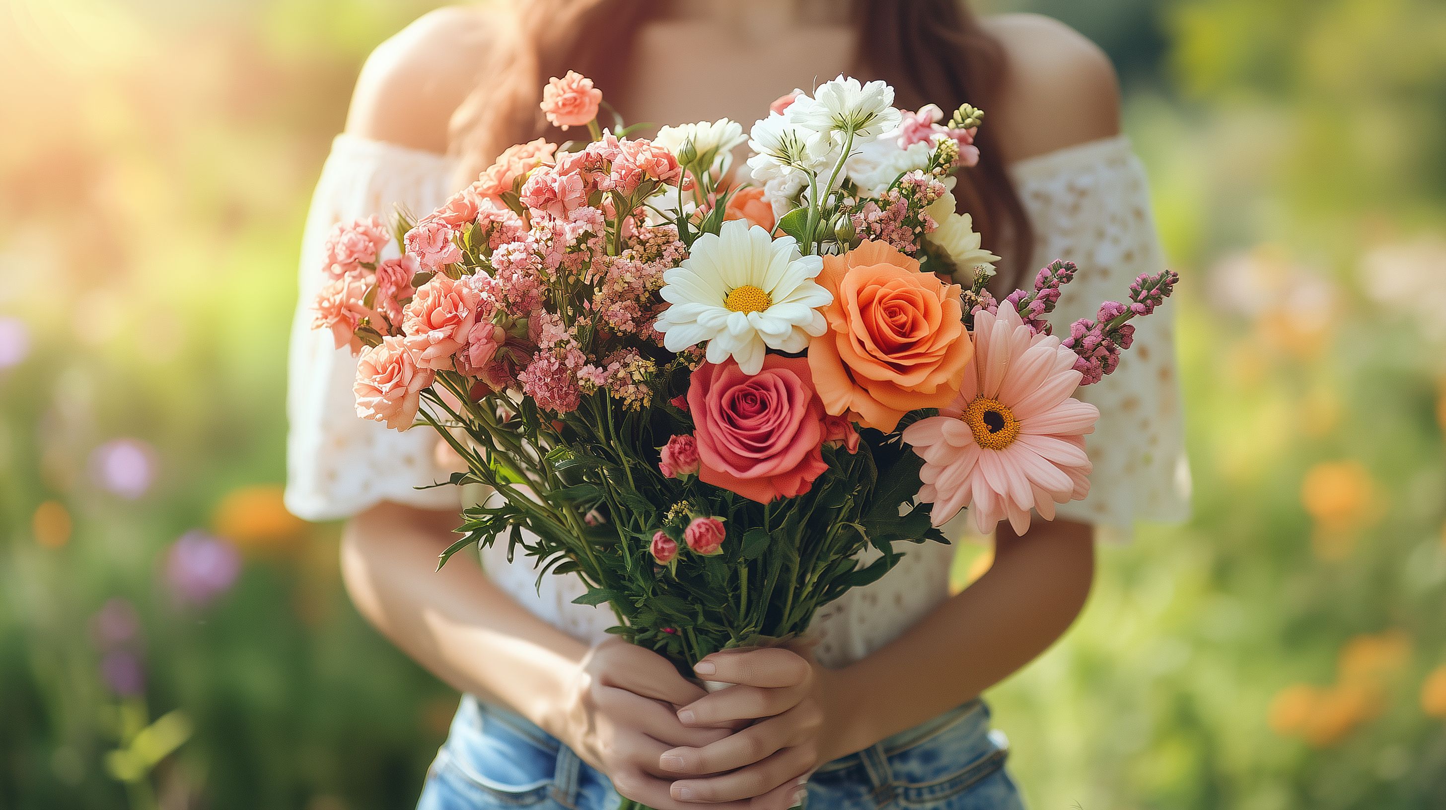 Das Bild zeigt eine Frau, die einen prächtigen Blumenstrauß in ihren Händen hält. Die Blumen erstrahlen in einer Vielzahl von sommerlichen Farben wie zartrosa, orange und weiß. Daisies, Rosen und andere bunte Blüten verleihen dem Arrangement eine fröhliche und natürliche Ausstrahlung. Der Hintergrund ist verschwommen, aber lässt eine grüne, sommerliche Umgebung erahnen. Dieses hochauflösende Stockfoto eignet sich hervorragend für Blogs, Newsletter, Social-Media-Posts oder Werbematerialien, in denen eine freudige, natürliche Stimmung vermittelt werden soll. Es steht unter einer Creative-Commons-Lizenz zur freien Verwendung zur Verfügung.