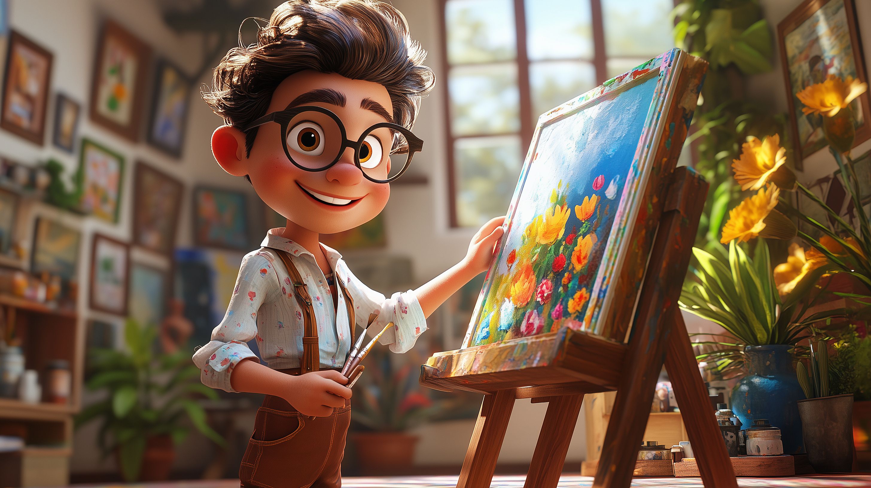 Das Foto zeigt einen fröhlichen und kreativen Künstler, der konzentriert an seinem neuesten Werk in seinem hellen, gemütlichen Atelierstudio arbeitet. Der Mann mit einer Brille und lockigen Haaren sitzt vor einer Staffelei und malt mit Pinsel und Palette eine bunte, farbenfrohe Szene auf der Leinwand. Im Hintergrund sind weitere gerahmte Kunstwerke an den Wänden zu sehen, umgeben von Pflanzen und dekorativen Elementen, die eine inspirierende, künstlerische Atmosphäre schaffen.