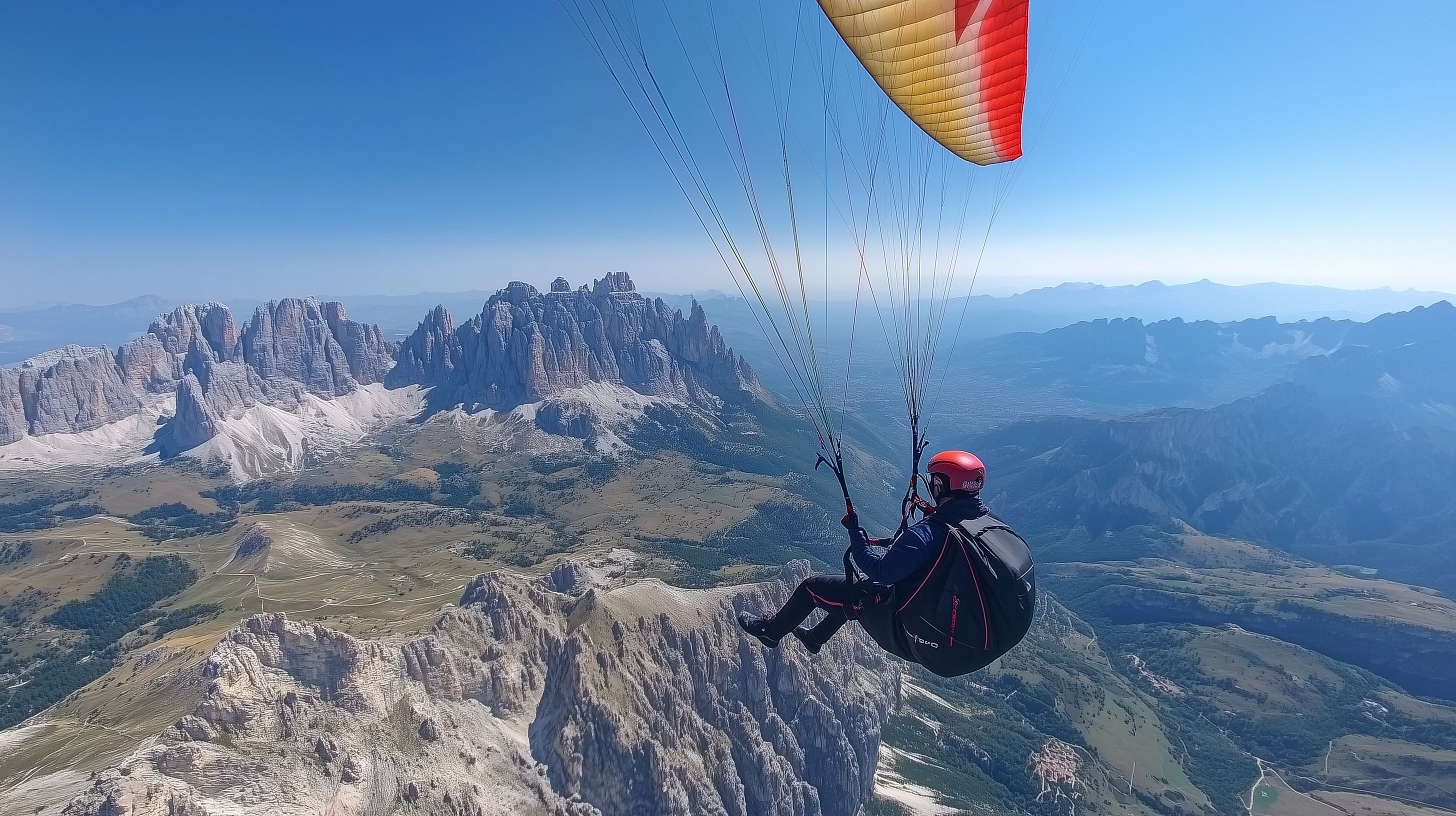 Das Foto zeigt einen Gleitschirmflieger, der über eine atemberaubende Berglandschaft in den Dolomiten in Südtirol schwebt. Im Hintergrund ragen hohe, schneebedeckte Gipfel und Felswände empor, die einen eindrucksvollen Kontrast zum klaren, blauen Himmel bilden. Der Gleitschirmflieger in voller Montur schwebt frei und schwebend über dieser majestätischen Kulisse, was ein Gefühl von Freiheit, Abenteuer und Verbindung mit der Natur vermittelt. Dieses hochauflösende Stockfoto unter einer Creative-Commons-Lizenz bietet sich für vielfältige Verwendungszwecke an, sei es für Reise-Blogs, Social-Media-Posts oder Werbematerialien im Outdoor- und Abenteuersegment.