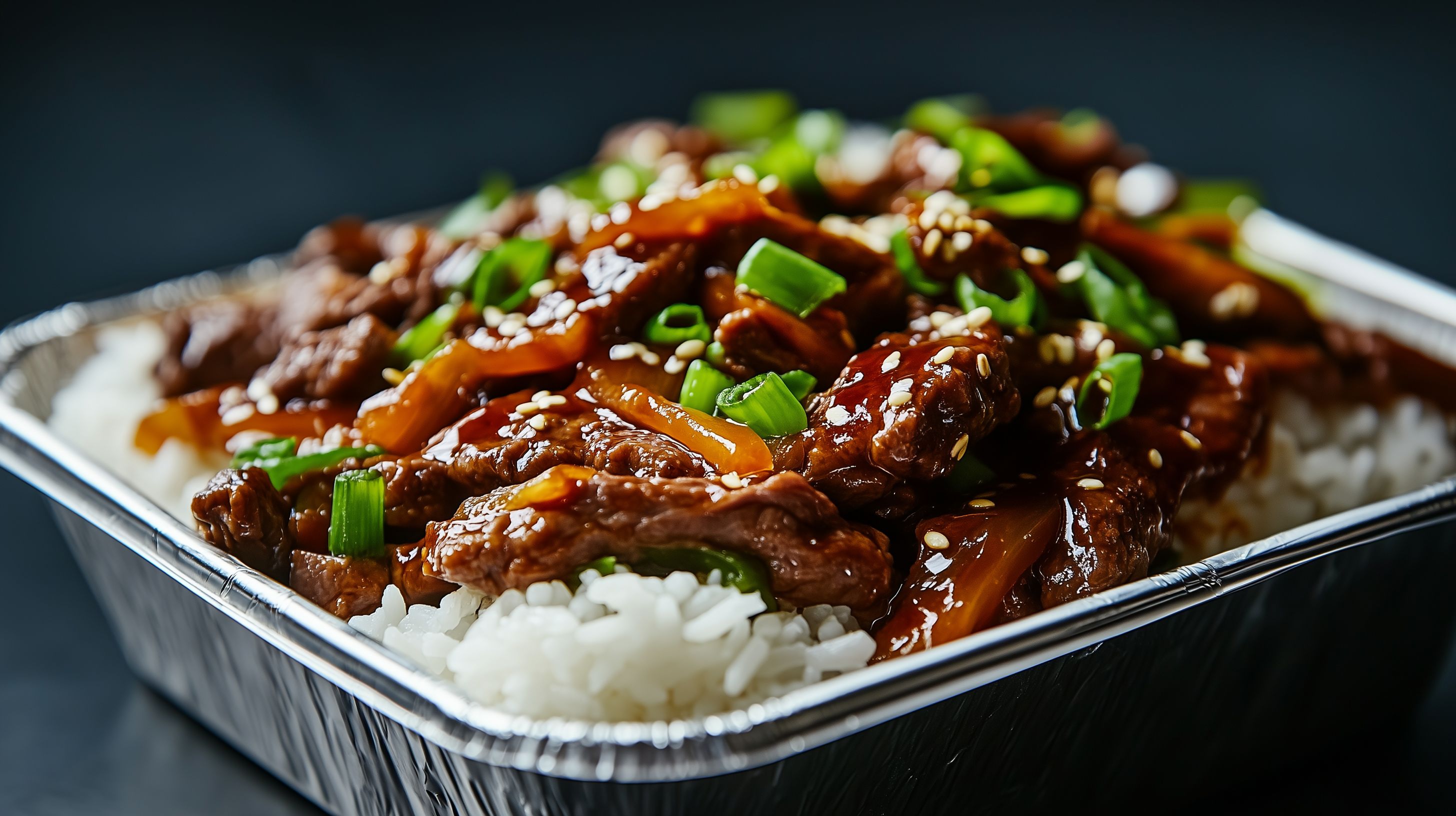 Dieses Foto zeigt ein traditionelles koreanisches Rindfleischgericht, das auf weißem Reis in einer Takeaway-Box angerichtet ist. Das Fleisch ist in einer dunklen, würzigen Sauce mit Sesamsamen und grünen Zwiebeln serviert. Das Gericht sieht sehr appetitlich und authentisch aus, mit intensiven Farben und einer einladenden Optik. Es eignet sich perfekt als kostenloses Stockfoto für Beiträge über asiatische Küche, Rezeptideen oder gesunde Ernährung in hoher Auflösung und unter Creative-Commons-Lizenz.