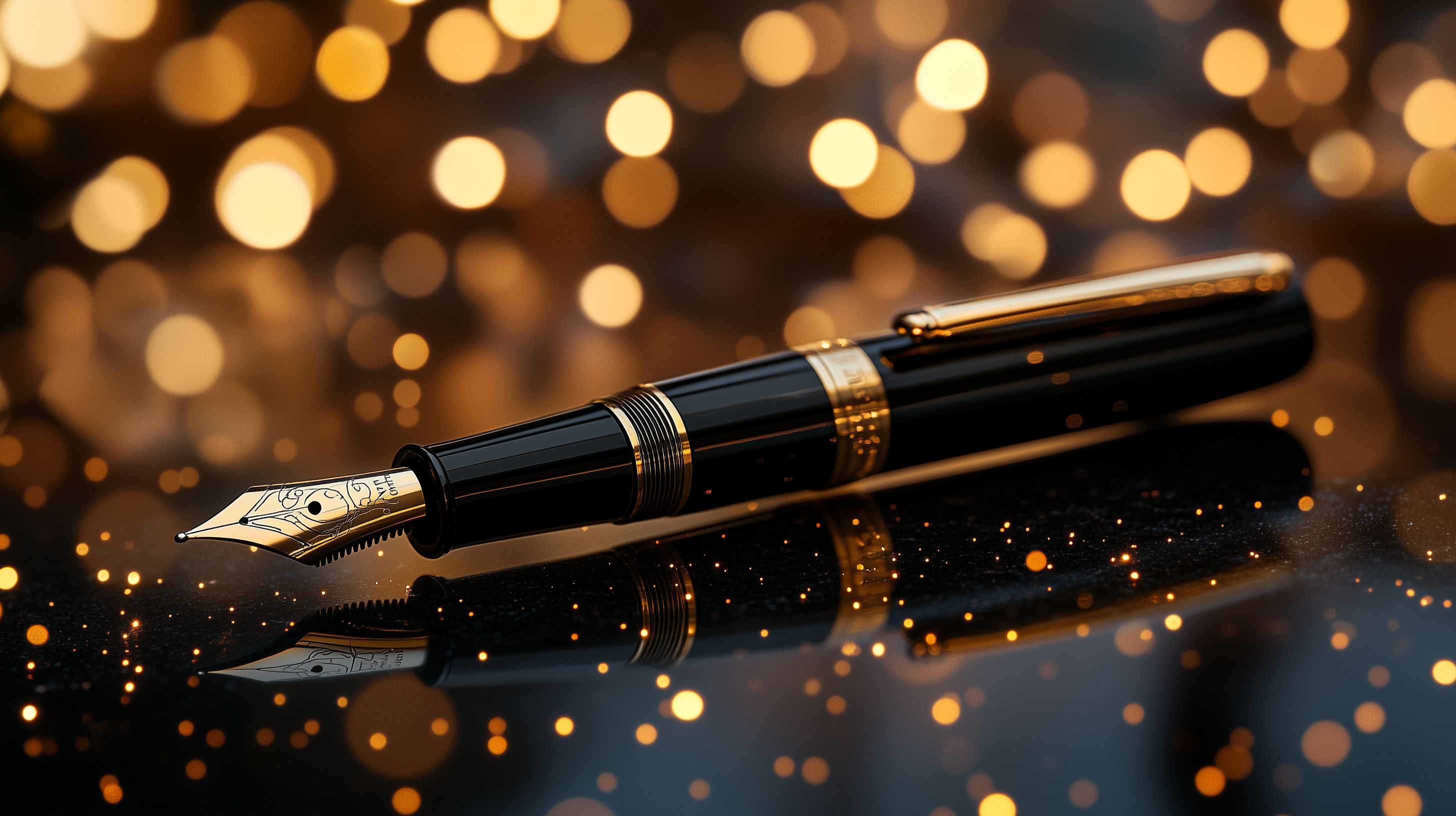 Das Bild zeigt einen eleganten, schwarzen Füllhalter vor einem funkelnden, goldfarbenen Hintergrund. Der Füllhalter ist aus hochwertigem Metall gefertigt und glänzt in der Nahaufnahme. Der Hintergrund ist verschwommen und erzeugt ein stimmungsvolles Bokeh-Effekt. Dieser exquisite Füllhalter wäre ein idealer Blickfang für Werbemittel, Blogbeiträge oder Social-Media-Postings rund um das Thema Schreiben, Büroausstattung oder Luxus-Accessoires. Das Bild ist in hoher Auflösung und unter einer Creative-Commons-Lizenz frei nutzbar.