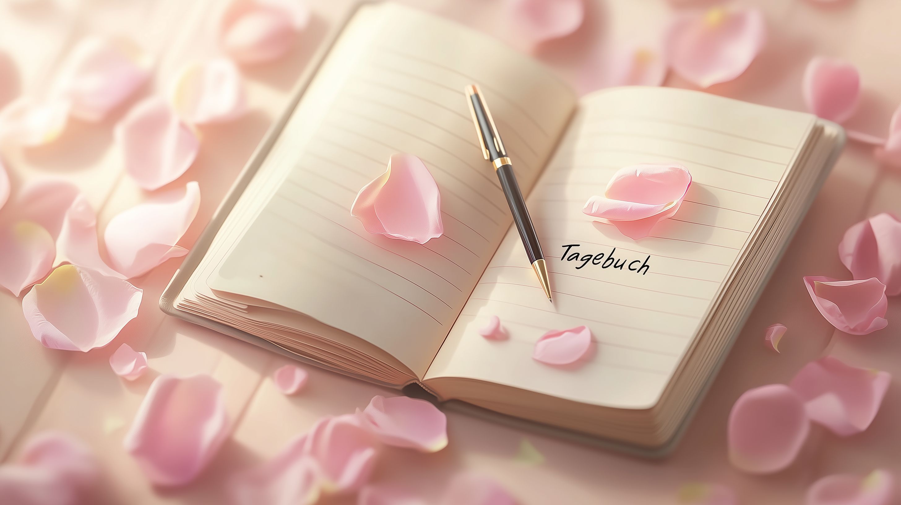Dieses stimmungsvolle Foto zeigt ein geöffnetes Tagebuch, umgeben von zarten rosafarbenen Blütenblättern. Der Fokus liegt auf dem Notizbuch, in dem eine handgeschriebene Überschrift 'Tagebuch' zu sehen ist. Die Blütenblätter sind liebevoll um das Buch verstreut, was eine romantische und inspirierende Atmosphäre schafft. Das Foto eignet sich hervorragend für den Einsatz in Blogs, Newslettern, Social-Media-Beiträgen oder Werbekampagnen, die einen weichen, natürlichen Look und Feelgood-Stimmung vermitteln möchten. Dieses hochauflösende Stockfoto steht unter der Creative-Commons-Lizenz zur freien Nutzung zur Verfügung.