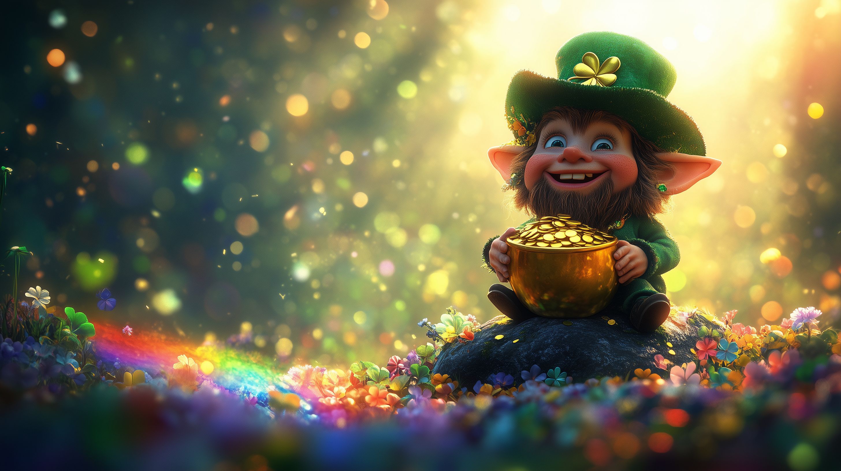 Dieses farbenfrohe und fantasievolle Bild zeigt einen lachenden, grüngekleideten Kobold, der einen goldenen Schatz in den Händen hält. Die Szene entfaltet sich inmitten einer blumenübersäten, leuchtenden Frühlingswiese, umgeben von funkelndem Lichtspiel und Regenbogenfarben. Der Kobold scheint die Freude und das Glück, das von dem Bild ausgeht, perfekt widerzuspiegeln.