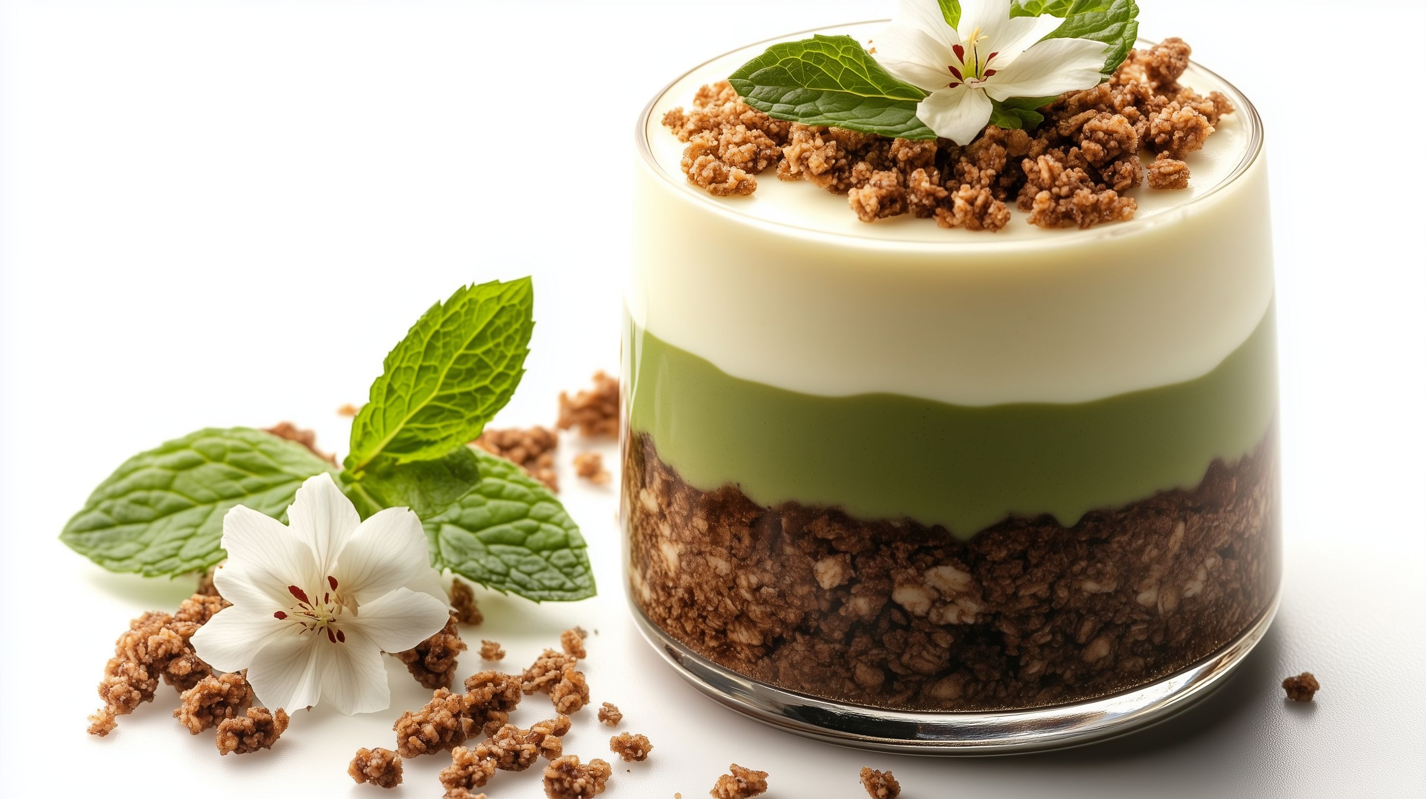 Dieses elegante Schichtdessert kombiniert geschmacksintensive Zutaten wie cremigen Matcha-Joghurt, knusprige Granola und frische Minzeblätter. Die grünen und weißen Farbtöne sowie die ansprechende Präsentation machen das Foto zu einem stilvollen Eye-Catcher, der sich ideal für Blogs, Newsletter oder Social-Media-Posts eignet. Als hochauflösendes Stockfoto unter Creative-Commons-Lizenz ist es kostenlos und frei nutzbar.