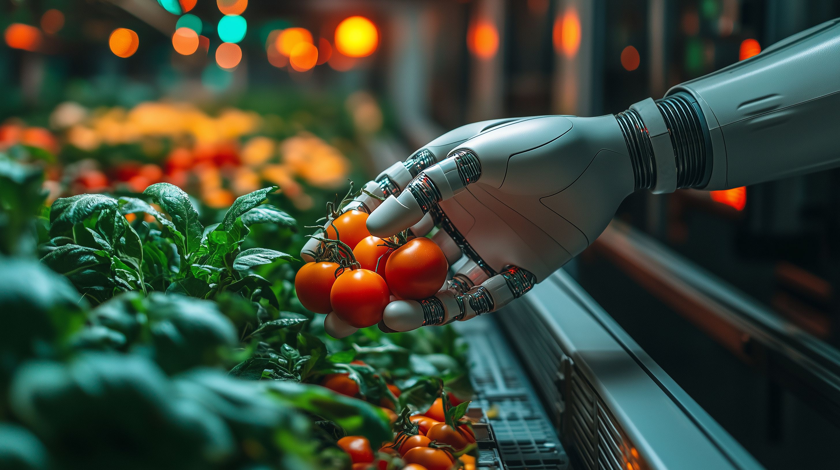 Dieses Foto zeigt eine Roboterhand, die soeben frische Bio-Tomaten aus einem Garten erntet. Die Tomaten sind saftig rot und stehen inmitten üppigen, grünen Laubs. Im Hintergrund sind verschwommen Lichter und Bokeh-Effekte zu sehen, die eine moderne, urbane Umgebung andeuten. Das Bild vermittelt einen Eindruck von fortschrittlicher, nachhaltiger Landwirtschaft, die Hightech-Lösungen mit organischem Anbau verbindet. Dieses hochwertige Stockfoto in hoher Auflösung eignet sich hervorragend für Blogs, Newsletter, Social-Media-Beiträge und Werbekampagnen rund um Themen wie gesunde Ernährung, Digitalisierung in der Landwirtschaft oder Umweltschutz. Es steht unter einer Creative-Commons-Lizenz zur kostenlosen Nutzung zur Verfügung.