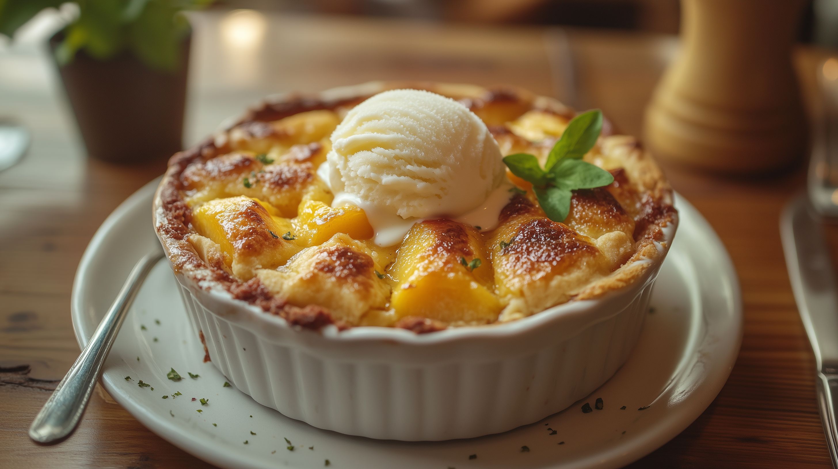 Das Bild zeigt einen appetitlichen rustikalen Pfirsichkuchen, serviert in einer weißen Keramikschüssel auf einem Holztisch. Der Kuchen ist mit einer goldbraunen, karamellisierten Oberfläche überzogen und wird von einer Kugel cremigen Vanilleeis und einem frischen Minzblatt garniert. Die Perspektive hebt die Zutaten und die sorgfältige Präsentation des Gerichts hervor. Dieses Foto eignet sich hervorragend für die Verwendung in Blogs, Newslettern, Social-Media-Beiträgen oder Werbekampagnen zum Thema Backwaren, Desserts, Gastronomie oder sommerliche Küche. Das hochauflösende Stockfoto ist unter der Creative-Commons-Lizenz frei verfügbar.