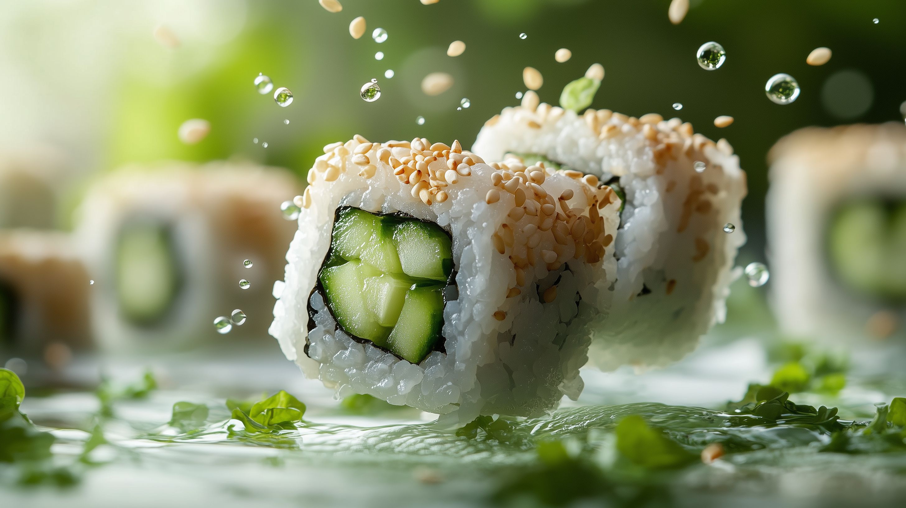 Dieses Foto zeigt eine frisch zubereitete Sushirolle, gefüllt mit knackiger Gurke und dekoriert mit goldenen Sesamsamen. Die Rolle ist in einem wasserdurchtränkten Umfeld platziert, was einen erfrischenden und dynamischen Eindruck erweckt. Der Kontrast zwischen dem satten Grün der Gurke, dem weißen Reis und den goldenen Sesamsamen erzeugt ein appetitliches und ästhetisch ansprechendes Bild. Dieses Stockfoto wäre ideal für die Verwendung in Blogs, Newslettern, Social-Media-Beiträgen oder Werbekampagnen zum Thema gesunde, leckere Snacks oder japanische Küche. Die hochauflösende Qualität und Creative-Commons-Lizenz machen es zu einem vielseitig einsetzbaren, kostenlosen Bildmaterial.