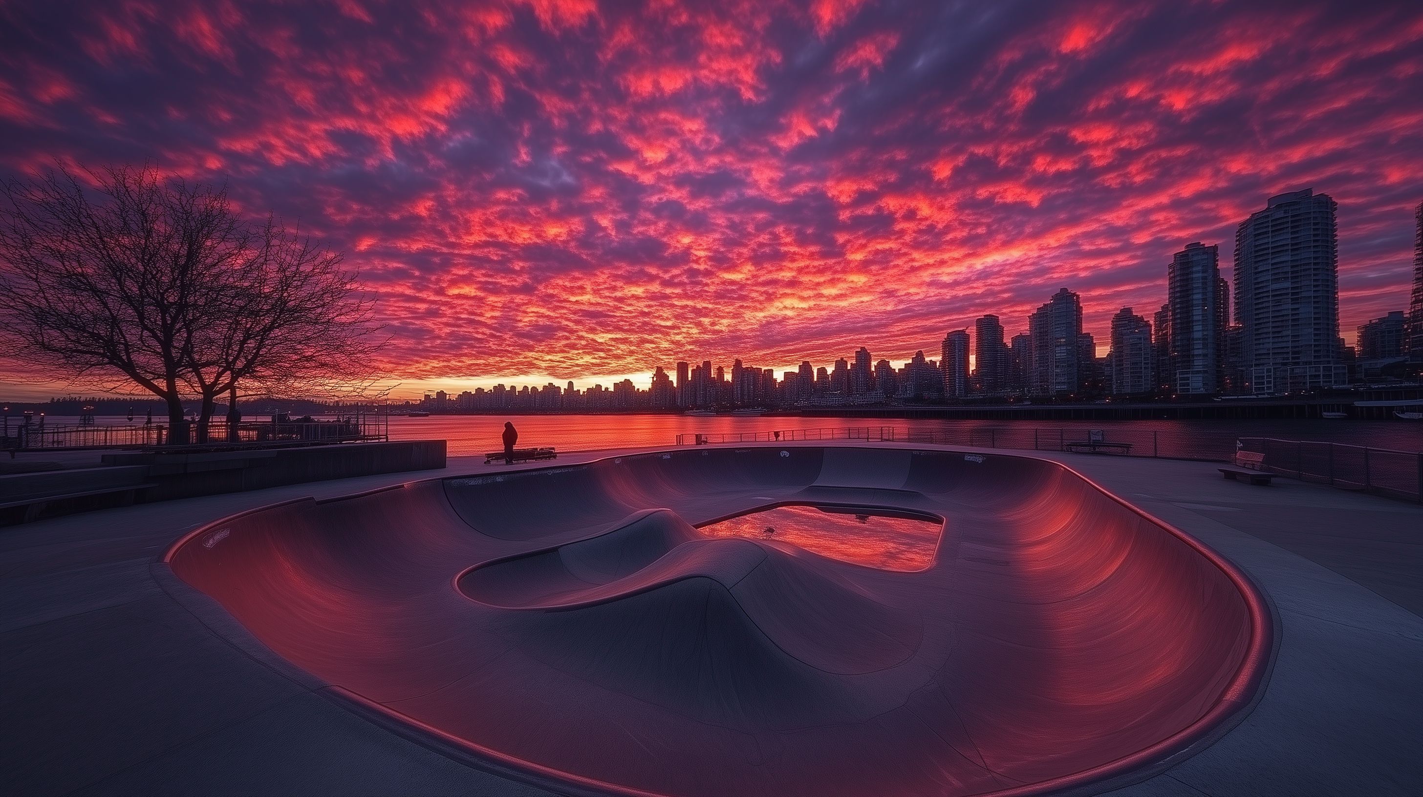 Dieses beeindruckende Foto zeigt einen dramatischen Sonnenuntergang über einer Großstadt. Am Horizont erhebt sich eine machtvolle Skyline von Hochhäusern, deren Umrisse sich deutlich gegen den feurig-roten Abendhimmel abzeichnen. Davor erstreckt sich ein Skatepark, dessen Rampen und Kurven die Aufmerksamkeit des Betrachters auf die dynamische Komposition lenken. Die Farbpalette des Bildes reicht von tiefen Orangetönen bis hin zu kräftigen Rottönen, die den Himmel in ein einzigartiges Farbspiel tauchen. Das Foto vermittelt eine Stimmung der Ruhe und Entspannung inmitten der Hektik einer Großstadt und eignet sich hervorragend als hochwertiges, kostenloses Stockfoto für verschiedenste Einsatzzwecke wie Blogs, Newsletter, Social Media und Werbematerialien. Mit seiner hohen Auflösung und der Creative-Commons-Lizenz bietet es eine flexible und rechtlich einwandfreie Nutzungsoption.