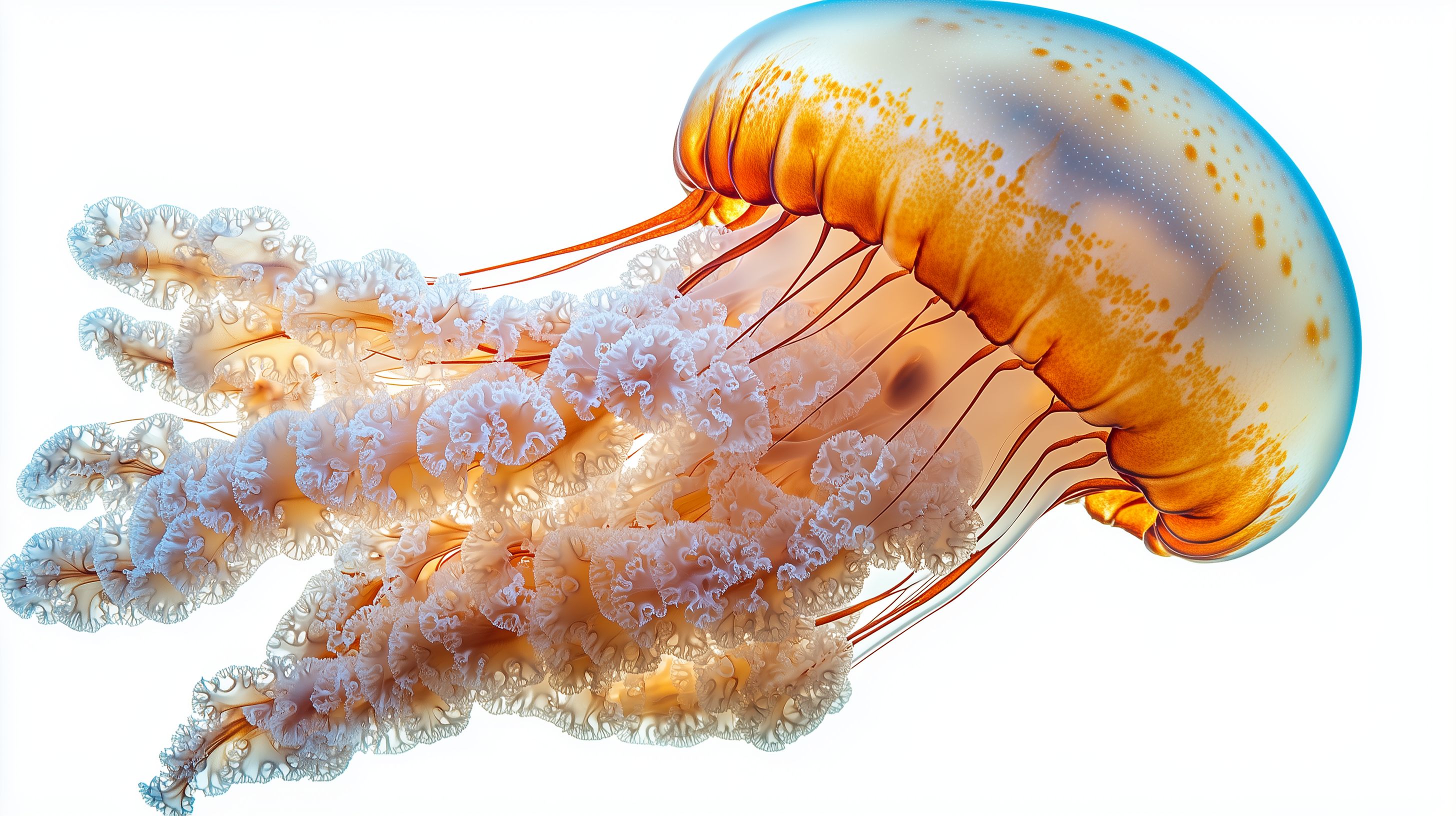 Dieses eindrucksvolle Foto zeigt eine bunte Qualle in Nahaufnahme vor weißem Hintergrund. Die detailreichen Tentakel und das durchscheinende Glockenkappenartige Körpergewebe sind in einem faszinierenden Farbspiel aus Orange, Blau und Weiß zu sehen. Diese Aufnahme eignet sich hervorragend für den Einsatz in Bildungspublikationen, Blogs oder Social-Media-Beiträgen zum Thema Meeresbiologie, Naturkunde oder Unterwasserfotografie. Das hochauflösende, frei nutzbare Stockfoto ist unter einer Creative-Commons-Lizenz verfügbar.