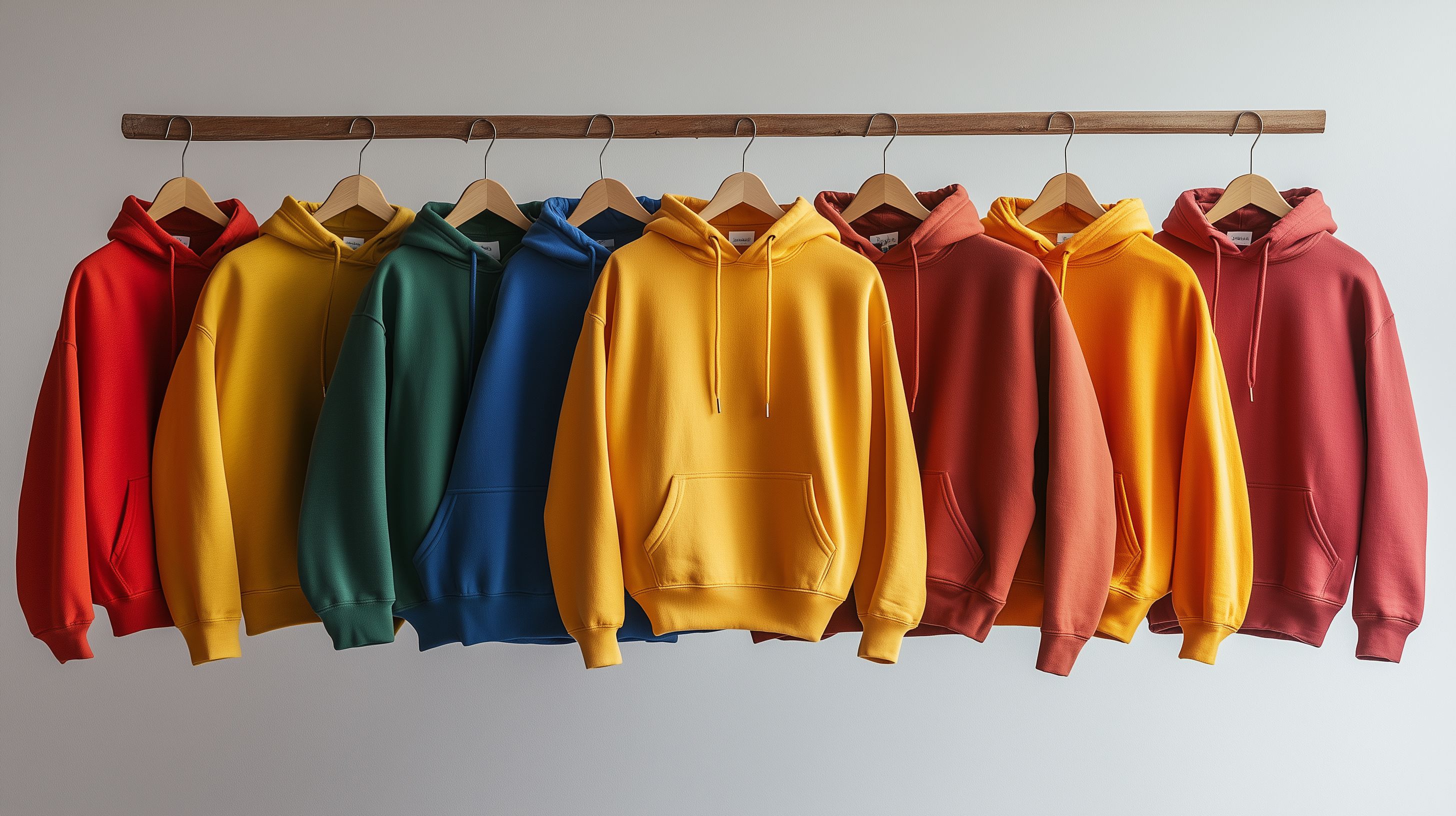 Dieses Foto zeigt ein farbenfrohe Auswahl an bunten Sweatshirts, die auf Kleiderbügeln aufgehängt sind. Die Hoodies sind in leuchtenden Farbtönen wie Rot, Gelb, Blau, Grün und Orange gehalten und scheinen in einem minimalistischen Studio-Setting fotografiert worden zu sein. Die Anordnung der Kleidungsstücke wirkt aufgeräumt und elegant, was sie zu einem idealen Motiv für die Verwendung in Werbe- und Marketing-Materialien wie Blogbeiträgen, Newslettern oder Social-Media-Posts macht. Als kostenloses, hochauflösendes Stockfoto unter einer Creative-Commons-Lizenz kann dieses Bild vielfältig eingesetzt werden.