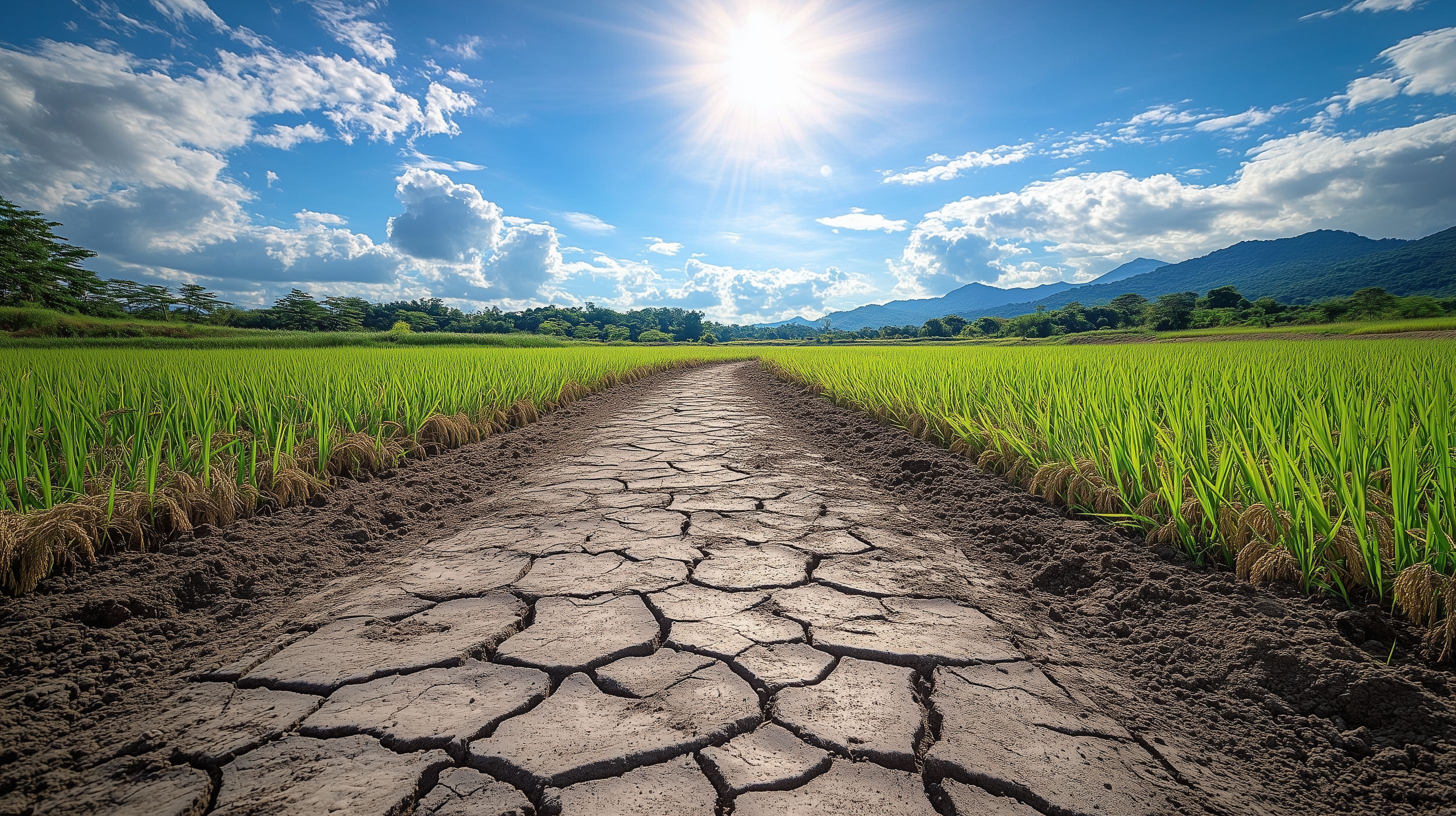 Dieses beeindruckende Bild zeigt eine weite Landschaft mit üppigen Reisfeldern, die sich unter einem strahlend blauen Himmel mit flauschigen Wolken erstrecken. Ein gewundener Feldweg führt durch die Mitte des Bildes, dessen Erde durch Trockenheit rissig geworden ist. Die Szene strahlt eine friedliche, ländliche Atmosphäre aus und lädt zum Verweilen ein. Dieses hochauflösende Stockfoto eignet sich hervorragend für den Einsatz in Blogs, Newslettern, sozialen Medien oder Werbematerialien, die eine natürliche und ästhetische Optik anstreben. Es steht unter einer Creative-Commons-Lizenz zur freien Nutzung zur Verfügung.