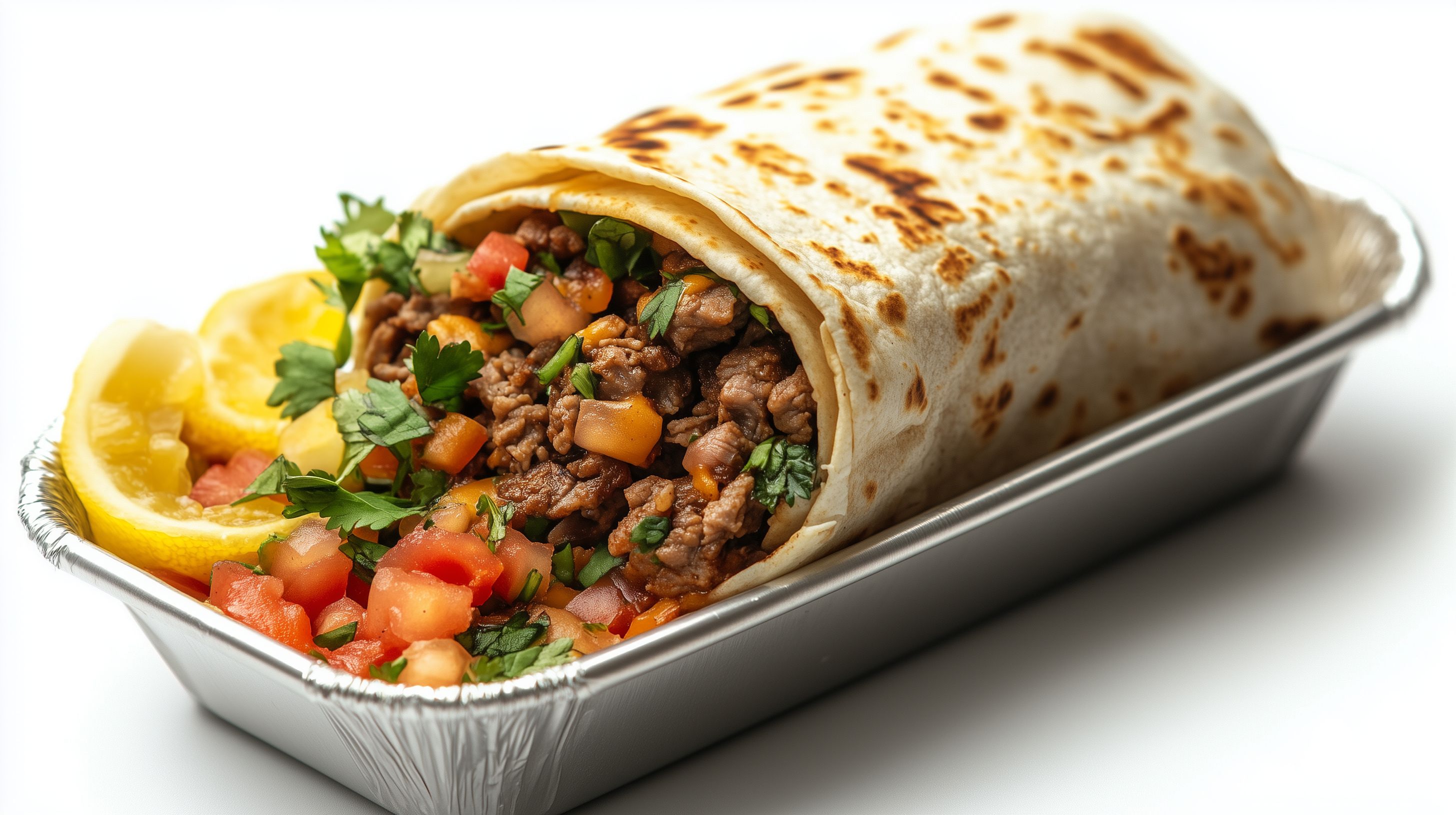 Das Bild zeigt einen appetitlichen Burrito, der mit Hackfleisch, Gemüse und Kräutern gefüllt ist. Der Burrito ist in eine Aluminiumverpackung eingewickelt und auf einem weißen Hintergrund platziert, was ihn in einem perfekten Licht erscheinen lässt. Die Zutaten sind frisch und sorgfältig angerichtet, was den Eindruck eines leckeren, gesunden Gerichts vermittelt. Dieses Stockfoto eignet sich hervorragend für Blogbeiträge, Newslettergestaltung, Social-Media-Aktivitäten und Werbematerialien rund um das Thema Tex-Mex-Küche, Mexikanisches Essen oder Gastronomie. Das Bild ist in hoher Auflösung verfügbar und steht unter einer Creative-Commons-Lizenz zur freien Verwendung zur Verfügung.