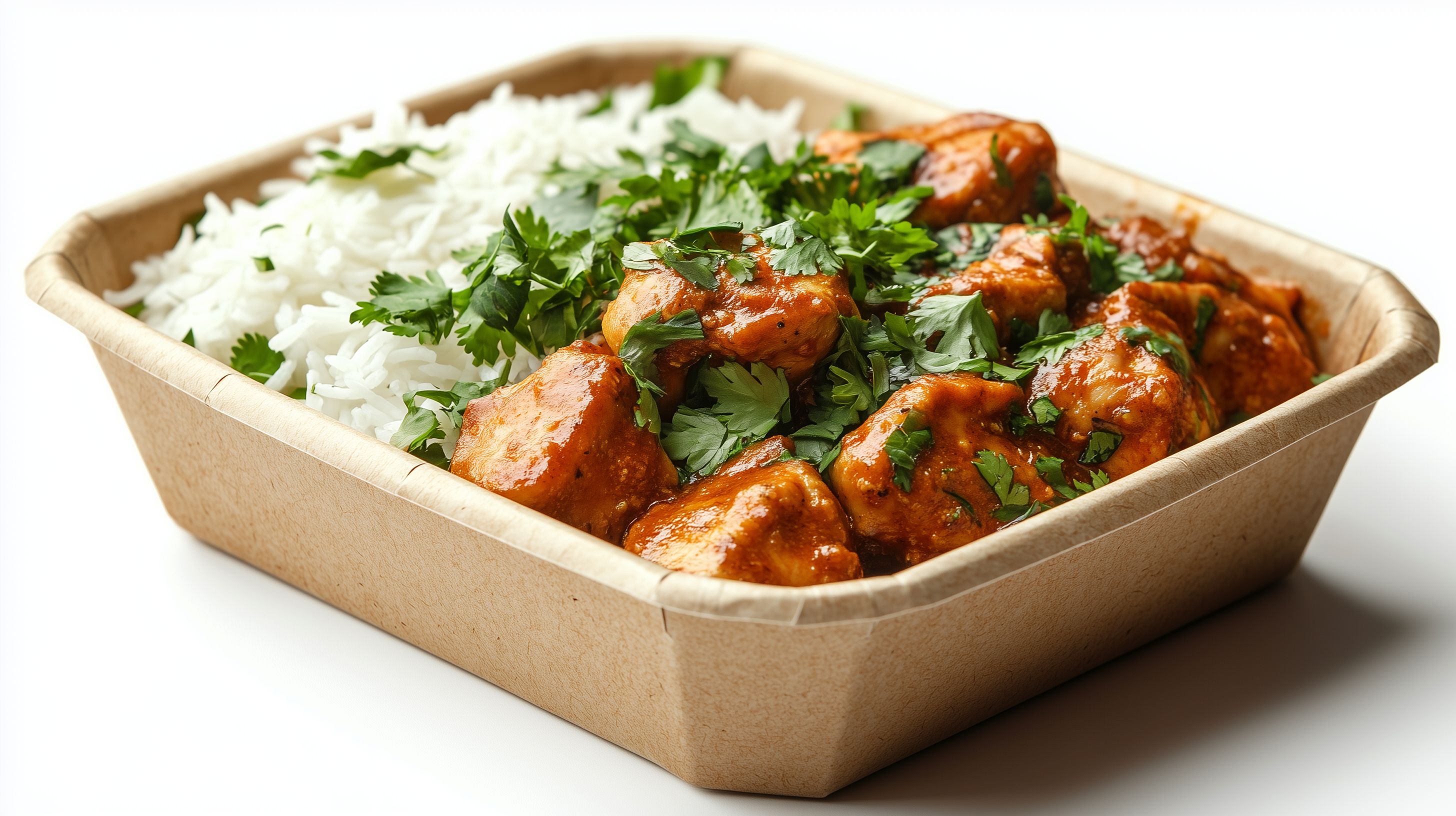 Das Bild zeigt ein appetitliches Gericht aus Butter Chicken, serviert mit Basmati-Reis in einer kompostierbaren Papierverpackung. Das Fleisch ist in einer würzigen, cremigen Soße eingebettet und mit frischen Kräutern garniert. Der Reis liegt separat neben dem Hähnchenragout. Die Draufsicht ermöglicht einen verlockenden Blick auf das leckere indische Gericht. Dieses hochauflösende Stockfoto eignet sich perfekt für die Verwendung in Blogs, Newslettern, auf Social-Media-Kanälen oder in Werbematerialien rund um das Thema Gastronomie, Kulinarik und gesunde Ernährung. Das Bild steht unter einer Creative-Commons-Lizenz zur kostenfreien Nutzung zur Verfügung.