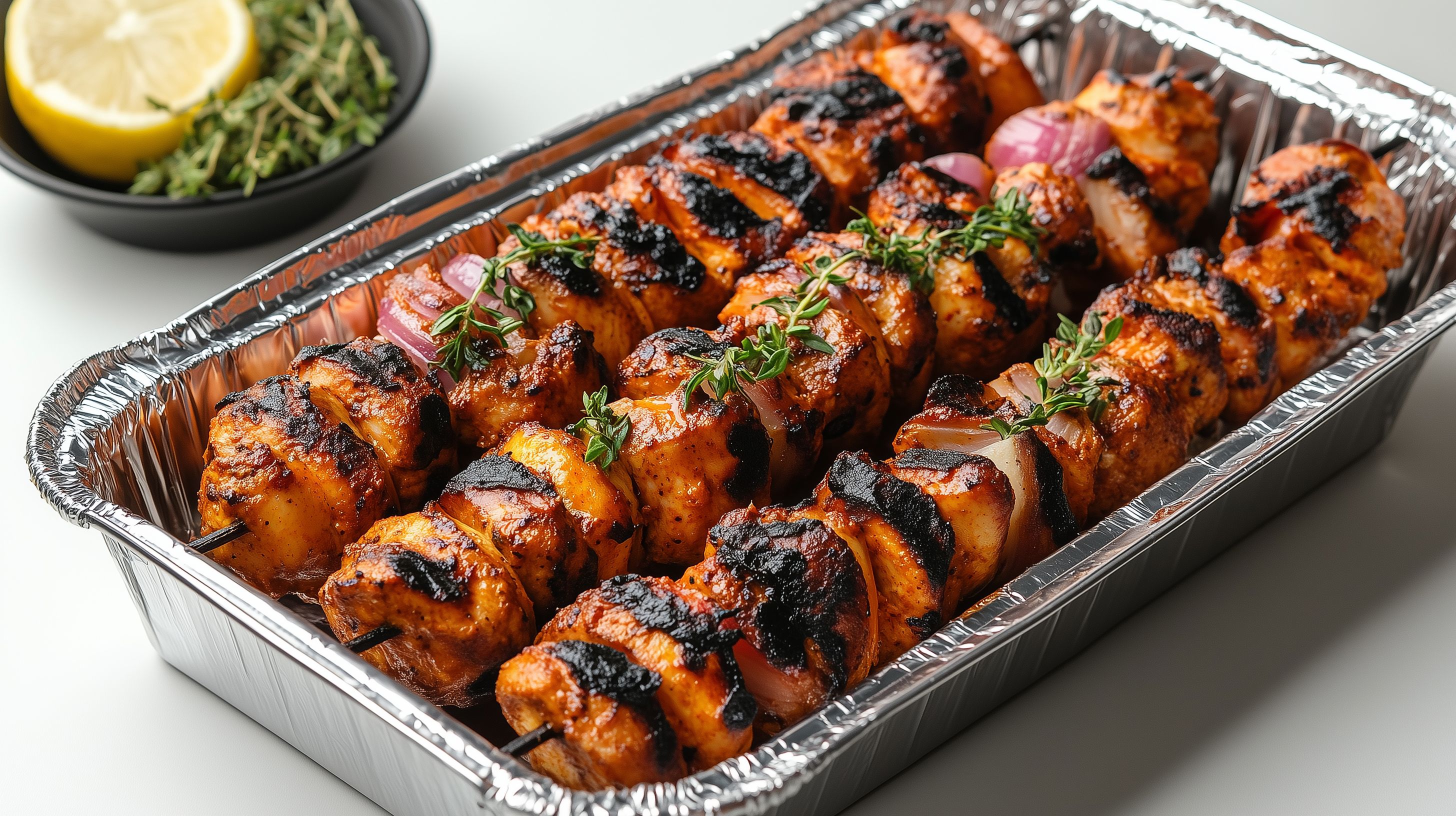 Das Bild zeigt einen Teller voller knuspriger, gegrillter Hähnchenspieße, die in einer Aluschale angerichtet wurden. Die Spieße sind mit einer satten, rötlich-orangen Marinade überzogen, die ihnen eine appetitliche Bräunung verliehen hat. Frische Zitronenscheiben und Petersilie verleihen dem Gericht einen frischen, aromatischen Akzent. Das Foto eignet sich perfekt als kostenloses Stockfoto für Blogs, Newsletter, Social Media-Beiträge oder Werbematerial rund um Grillgerichte, Imbissangebote oder die Außer-Haus-Gastronomie. Das hochauflösende Bild steht unter einer Creative Commons-Lizenz zur Verfügung.