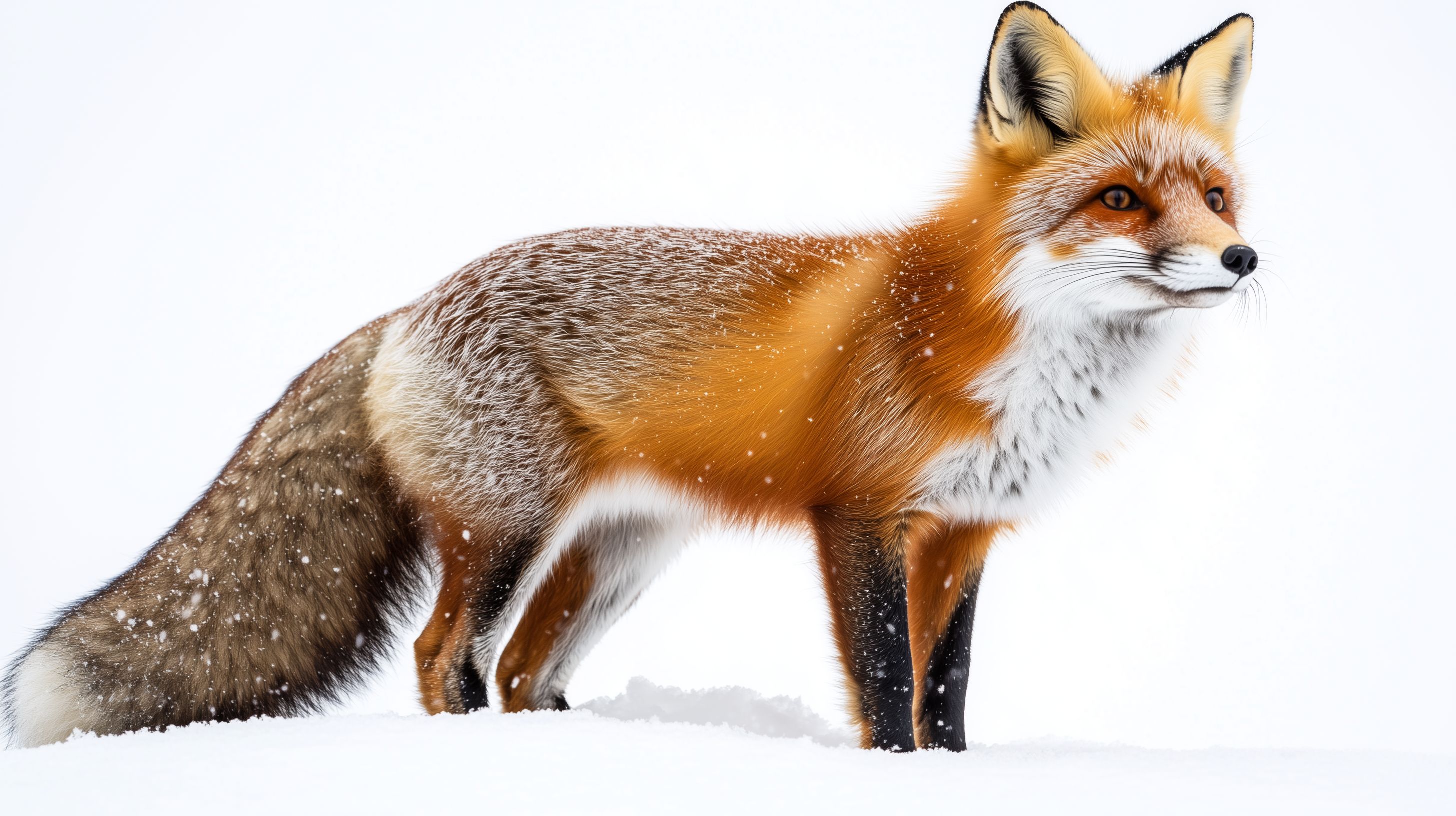 Das Foto zeigt einen Rotfuchs, der inmitten einer Winterlandschaft mit Schnee zu sehen ist. Das Tier steht im Vordergrund, sein Körper leicht nach links gedreht. Der Fuchs hat ein dichtes, orangerotes Fell, das vom Schnee bedeckt ist. Sein Gesicht ist in einer lebendigen Nahaufnahme zu sehen, mit wachen Augen und gespitzten Ohren. Die klare, weiße Umgebung verleiht dem Bild eine kühle, ruhige Atmosphäre und lässt den Rotfuchs in seiner natürlichen Umgebung stehen.
