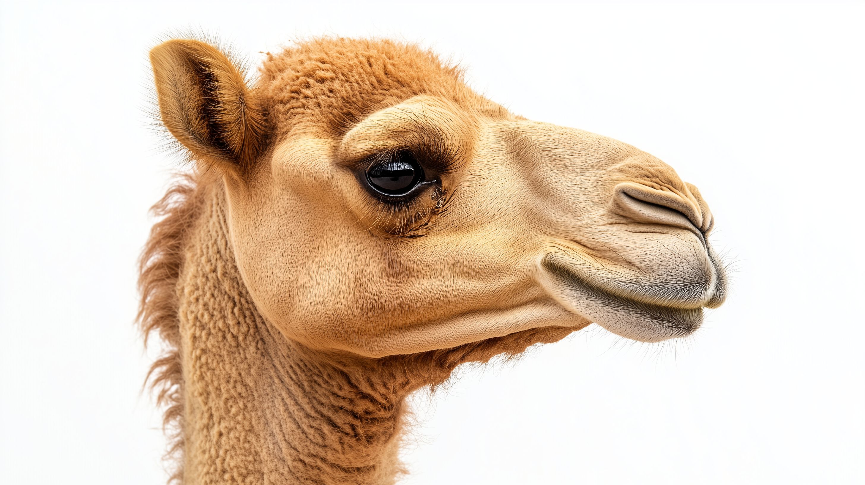 Dieses hochauflösende Stockfoto zeigt das freundliche Porträt eines Kamels im Profil. Das Tier hat eine ruhige, geduldig wirkende Ausstrahlung mit seinen großen, braunen Augen, der markanten Nase und den feinen Gesichtszügen. Das weiche, beige Fell des Kamelkopfes hebt sich vor dem neutralen weißen Hintergrund eindrucksvoll ab. Dieses authentische Naturporträt eignet sich hervorragend als kostenloses Stockfoto für Blogs, Newsletter, Social-Media-Kanäle oder Werbezwecke unter Creative-Commons-Lizenz.