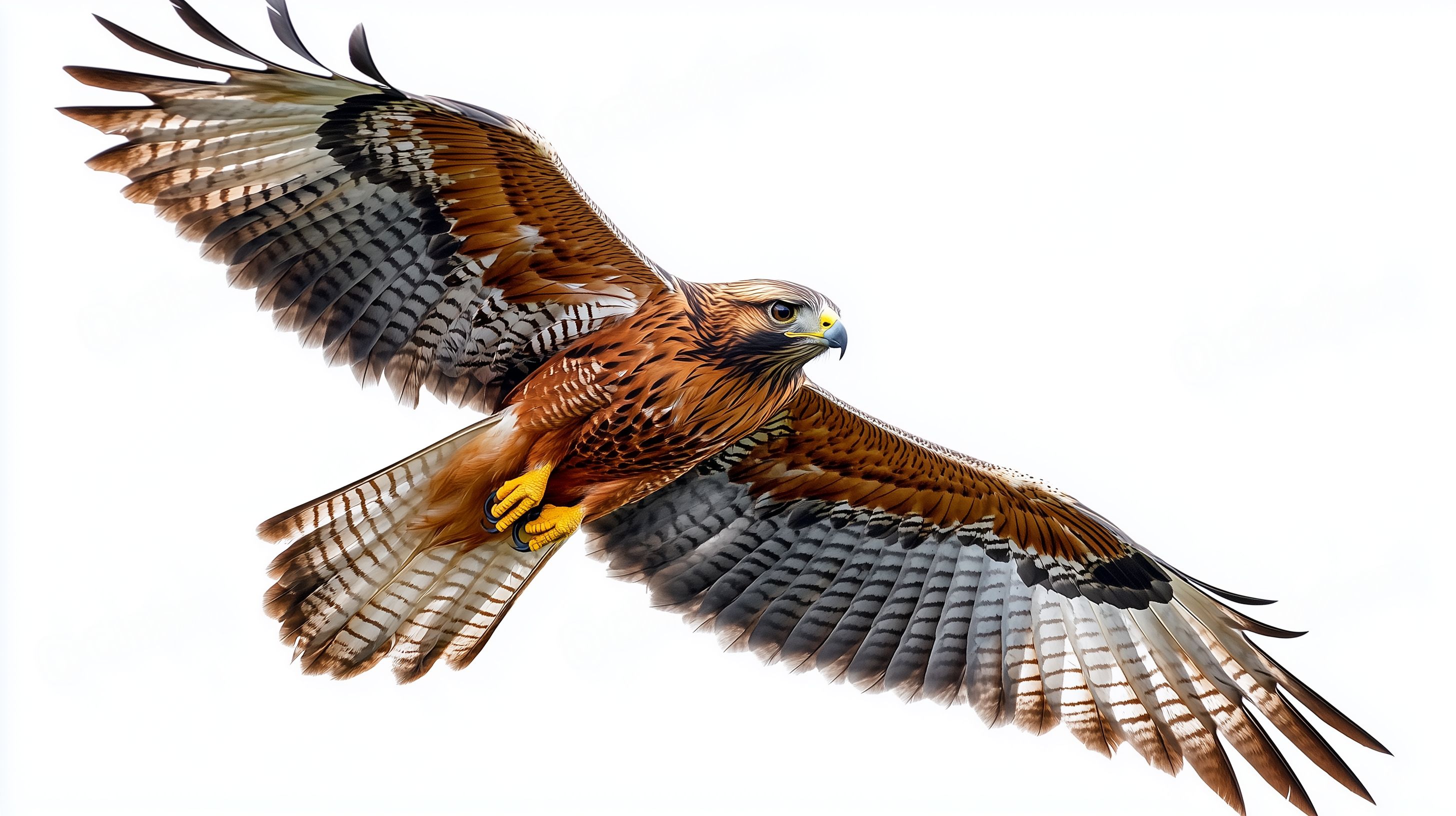Dieses beeindruckende Foto zeigt einen majestätischen Greifvogel, vermutlich einen Habicht, in vollem Flug. Das Bild ist aus einer Nahaufnahme-Perspektive aufgenommen, sodass die Details des Gefieders, der Schwingen und der Augen des Vogels deutlich sichtbar sind. Die warmen Braun- und Orangetöne des Gefieders kontrastieren perfekt mit dem weißen Hintergrund, was dem Foto eine klare, fokussierte Ästhetik verleiht.