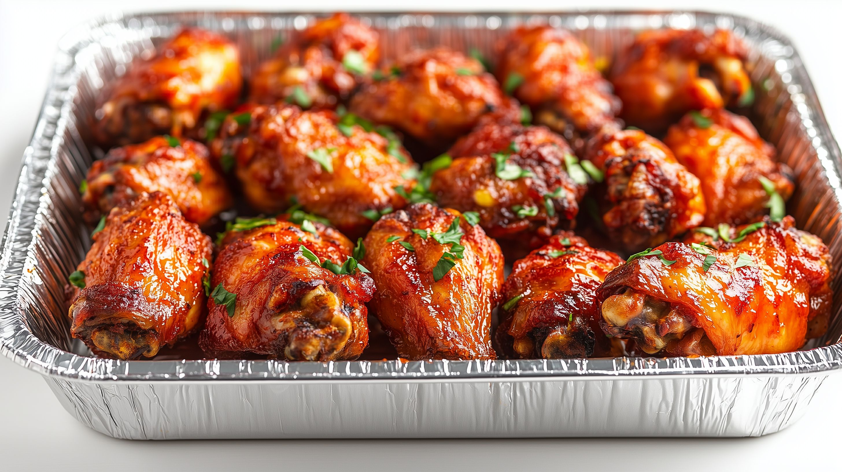 Das Bild zeigt einen Behälter voller knuspriger, appetitlich aussehender Hähnchenflügel. Die Flügel sind in einer Aluminium-Schale angerichtet und haben eine intensive, dunkelrote bis bräunliche Farbe. Sie scheinen mit einer würzigen, leicht karamelligen Sauce oder Marinade bestrichen zu sein und sind mit frisch gehackter Petersilie garniert, was dem Gericht eine dekorative Note verleiht.