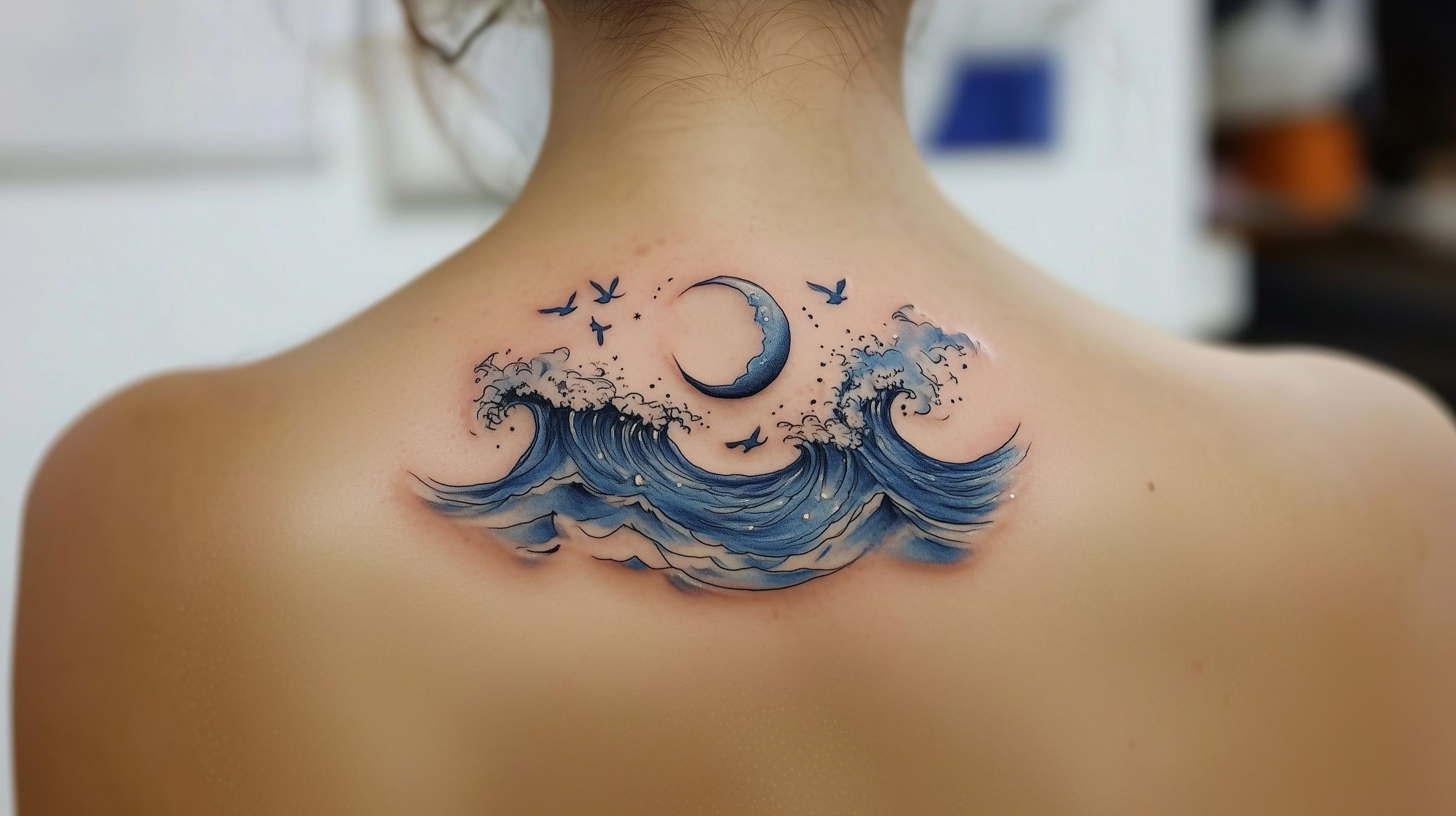 Dieses faszinierende Foto zeigt eine detaillierte Tätowierung auf dem Rücken einer Person. Die Tätowierung stellt eine Szene aus der Natur dar - eine Reihe von Ozeanwellen, die sich unter einem mystischen Vollmond auftürmen. Die Wellen sind in verschiedenen Blautönen gehalten und wirken durch die gezackten Konturen sehr lebhaft und dynamisch. Kleine Vögel scheinen über den Wellen zu schweben, was dem Motiv eine zusätzliche Ebene von Bewegung und Freiheit verleiht.