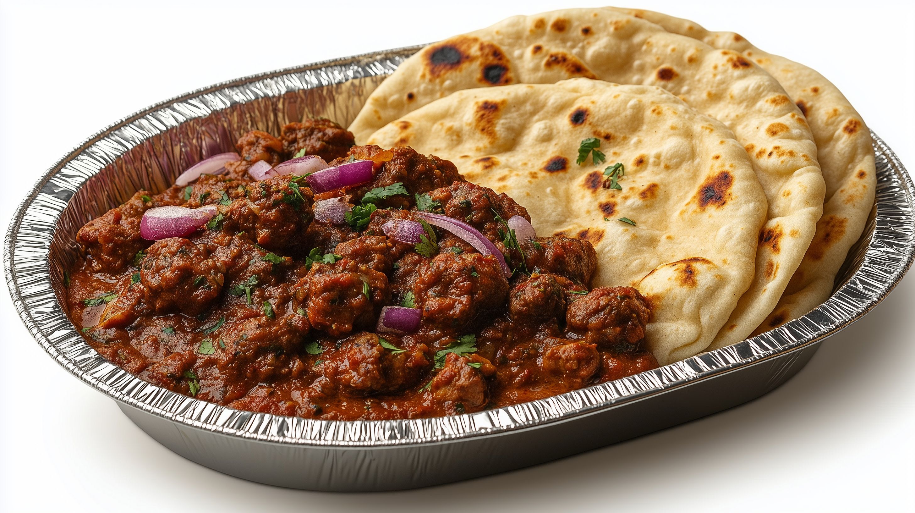 Das Foto zeigt ein leckeres indisches Lamm-Vindaloo-Curry, das in einer Aluminiumschale serviert wird. Das würzige und pikante Fleischgericht ist mit bunten Gemüsestückchen und frisch zubereitetem Naan-Brot garniert. Die rustikale Präsentation und die warmen Farbtöne machen das Bild zu einem idealen Stockfoto für Food-Blogs, Online-Magazine oder Werbung rund um asiatische Küche und exotische Gerichte. Das hochauflösende Foto steht unter einer Creative-Commons-Lizenz kostenlos zum Download zur Verfügung.