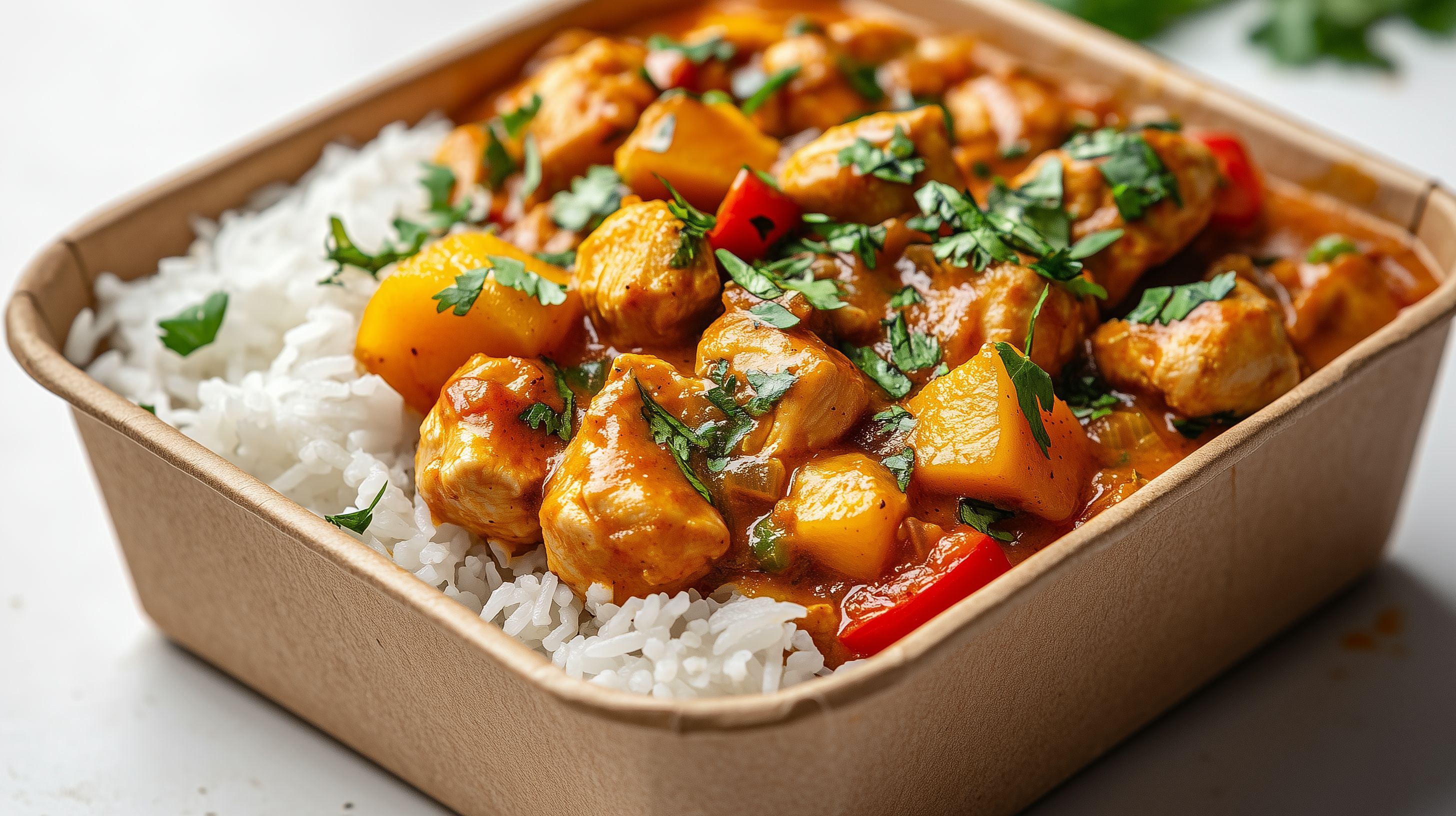 Das Bild zeigt ein leckeres Asia-Curry-Gericht mit Hühnchen, Paprika und anderen Gemüsestücken, serviert auf einem Bett von weißem Reis in einer biologisch abbaubaren Schale. Die Zutaten sind appetitlich angerichtet und verleihen dem Gericht eine schöne Farbgebung. Das Curry sieht aufgrund der verwendeten Gewürze und Kräuter sehr aromatisch und genussvoll aus. Dieses Foto eignet sich hervorragend als kostenloses Stockfoto für Blogger, Social-Media-Posts oder Werbematerialien im Bereich der gesunden und internationalen Küche. Die hochauflösende Darstellung in kreativer Komposition lässt sich unter der Creative-Commons-Lizenz frei nutzen.
