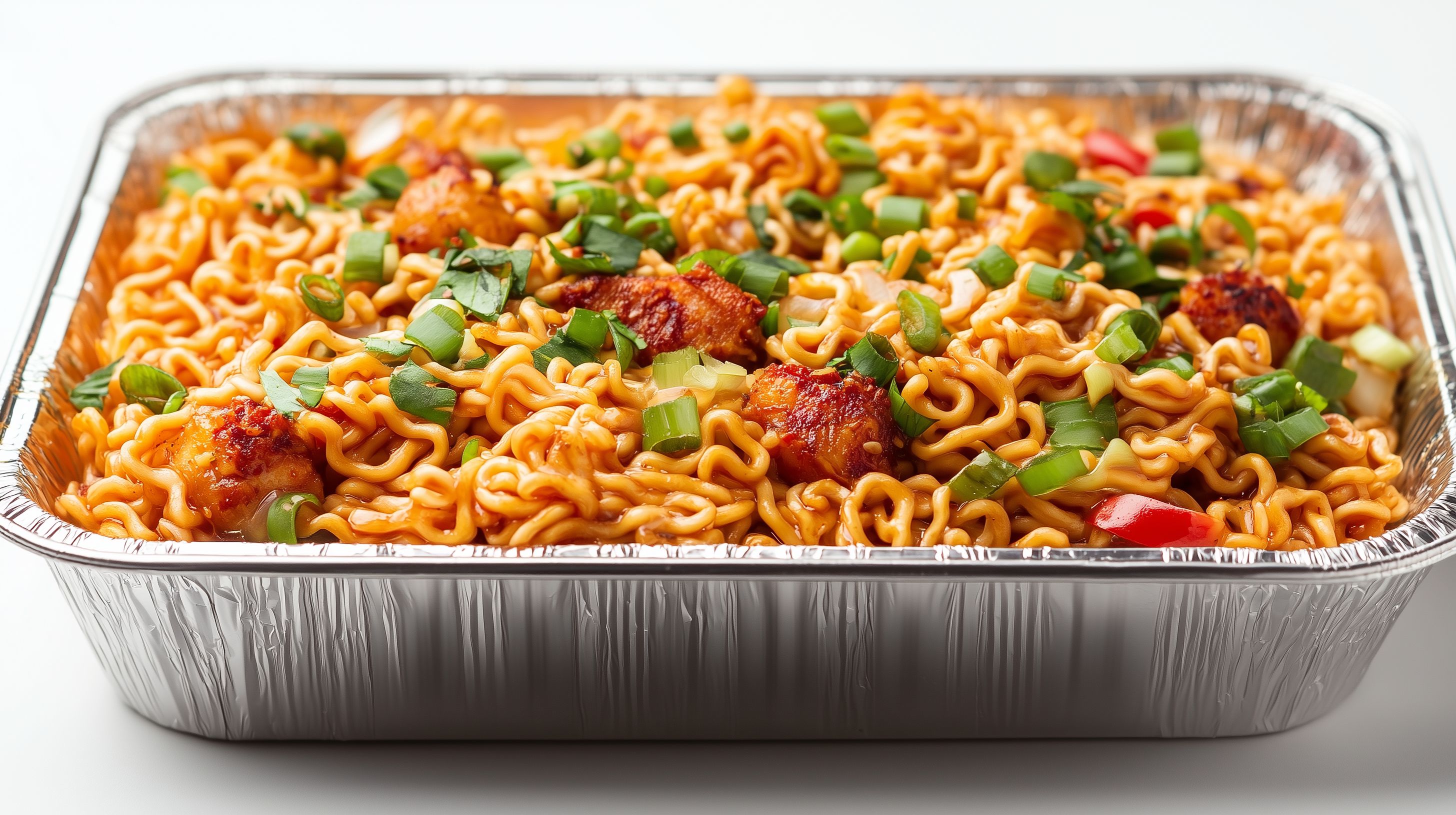Dieses Foto zeigt eine appetitliche Portion köstlicher asiatischer Nudeln in einer Aluminiumschale. Die Nudelgerichte sind mit würzigen Saucen, knackigem Gemüse und leckeren Zutaten wie gebratenem Fleisch oder Tofu angerichtet. Der Blick fällt auf die farbenfrohe Mischung aus goldgelben Nudeln, grünem Gemüse und roten Akzenten. Dieses hochauflösende Stockfoto in hervorragender Qualität eignet sich ideal für den Einsatz in Blogs, Newslettern, Social-Media-Beiträgen oder Werbekampagnen zum Thema asiatische Küche, Fastfood oder gesunde Ernährung. Aufgrund der offenen Creative-Commons-Lizenz kann das Foto kostenfrei genutzt werden.
