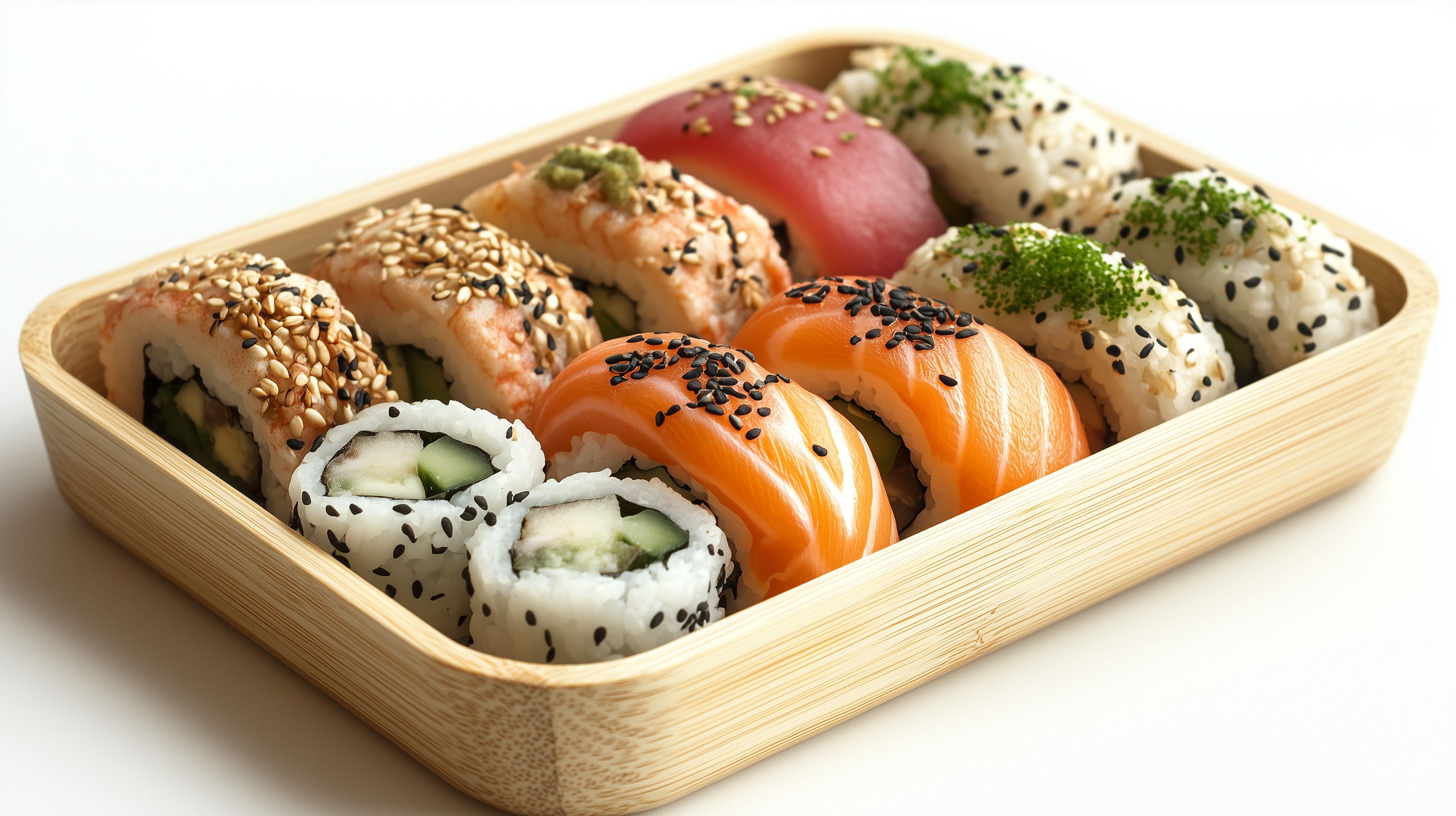 Das Bild zeigt eine Auswahl an leckeren, frischen Sushi-Rollen in einer hochwertigen Bambus-Schale. Die farbenfrohen Sushi-Stücke sind mit verschiedenen Zutaten wie Fisch, Reis, Nori, Sesam und Gemüse wie Gurke und Avocado gefüllt. Die Anordnung der Sushi-Rollen und -Happen ist appetitlich und ästhetisch ansprechend. Das Foto eignet sich hervorragend als kostenloses Stockfoto für die Verwendung in Blogs, Newslettern oder Social-Media-Beiträgen rund um japanische Küche, gesunde Ernährung oder hochwertige Lebensmittel. Die hohe Bildauflösung und die Creative-Commons-Lizenz ermöglichen eine vielfältige Nutzung.