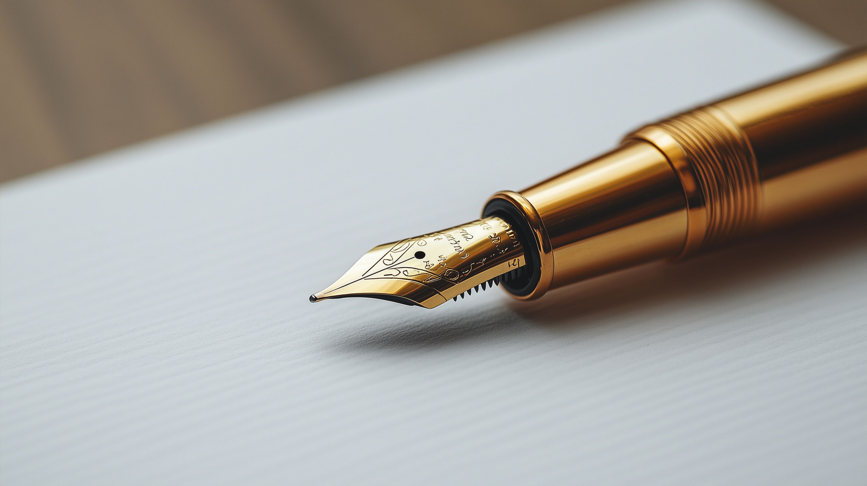 Diese hochwertige Nahaufnahme zeigt einen eleganten, goldenen Füllhalter, der eine Unterschrift auf einer weißen Oberfläche hinterlässt. Der Füllhalter ist mit einer feinen, verzierten Spitze ausgestattet und sticht durch seine glänzenden, goldenen Akzente hervor. Der Hintergrund ist leicht unscharf, was den Fokus auf das Schreibwerkzeug lenkt. Dieses Stockfoto eignet sich hervorragend für Blogs, Newsletter, Social-Media-Posts oder Werbematerialien rund um das Thema Schreiben, Büroartikel oder hochwertige Produktpräsentation. Die Auflösung ist für eine professionelle Nutzung geeignet und steht unter einer Creative-Commons-Lizenz zur Verfügung.