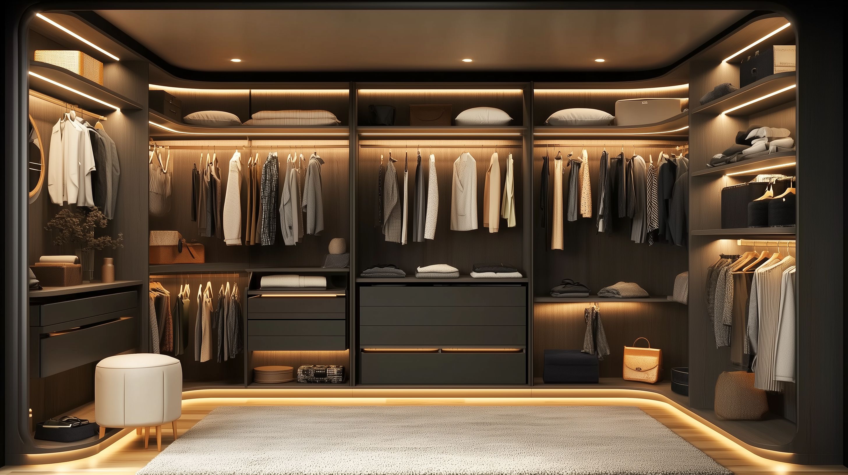 Dieses Foto zeigt einen modernen, begehbaren Kleiderschrank mit luxuriöser Ausstrahlung. Der Raum ist mit indirekter Beleuchtung ausgestattet, die eine warme, gemütliche Atmosphäre schafft. Die Regale sind mit hochwertiger Bekleidung und Accessoires gefüllt, die perfekt präsentiert werden. Der Boden ist mit einem hellen Teppich ausgelegt, der den Raum noch gemütlicher wirken lässt. Dieses Stockfoto eignet sich hervorragend für Blogs, Newsletter, Social-Media-Posts oder Werbematerialien rund um Innenarchitektur, Wohnen, Mode und Lifestyle. Das hochwertige Foto ist in hoher Auflösung und unter einer Creative-Commons-Lizenz verfügbar.
