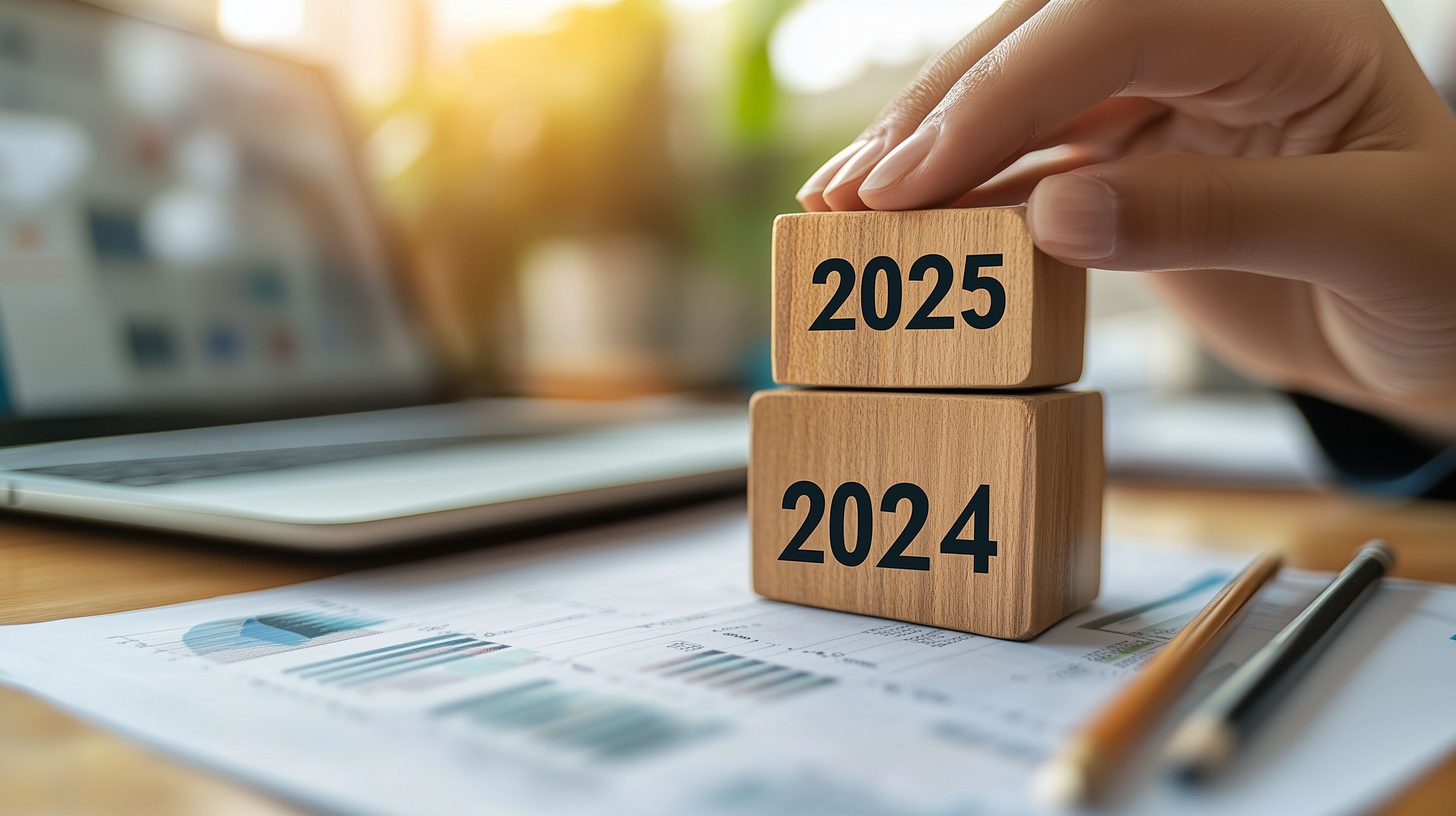 Dieses Foto zeigt einen Tisch mit Dokumenten und einem Laptop, auf dem zwei Holzblöcke mit den Jahreszahlen 2024 und 2025 platziert sind. Die Hand einer Person positioniert die Blöcke, was auf die Planung und Vorbereitung für die kommenden Jahre hindeutet. Das Bild vermittelt ein Gefühl von Vorausschau, strategischer Planung und dem Streben nach Zielerreichung in einem Geschäftskontext. Es eignet sich hervorragend als kostenloses Stockfoto für Blogs, Newsletter, Social-Media-Beiträge und Werbematerialien zum Thema Zukunftsplanung, Zeitmanagement und Unternehmensentwicklung. Die hochwertige Auflösung und Creative-Commons-Lizenz machen dieses Foto zu einem nützlichen und flexibel einsetzbaren Asset.