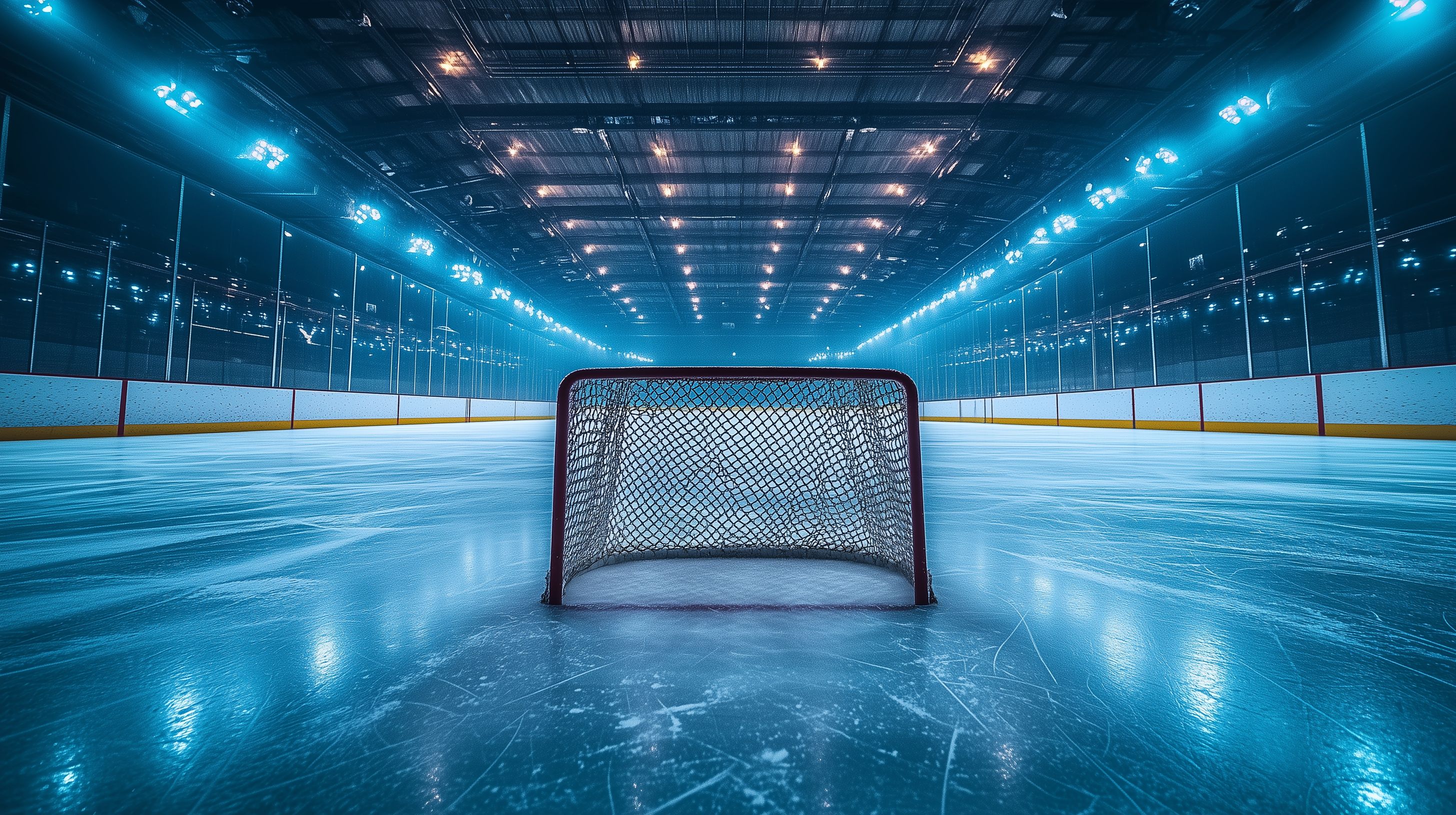 Das Bild zeigt eine riesige, lichtdurchflutete Eishockeyhalle mit einem Tor in der Mitte der Eisfläche. Die Halle ist in warmen, blauen Tönen gehalten, mit vielen Lichtquellen an der Decke, die sich in der glatten Eisfläche reflektieren. Die weite, offene Perspektive und der leere Raum vermitteln eine Stimmung der Ruhe und Weite. Dieses faszinierende Foto eignet sich ideal als Hintergrundbild für Websites, Blogs oder Social-Media-Posts zum Thema Eishockey, Winter oder Sport. Das hochauflösende Bild steht unter einer Creative-Commons-Lizenz kostenfrei zur Verfügung.