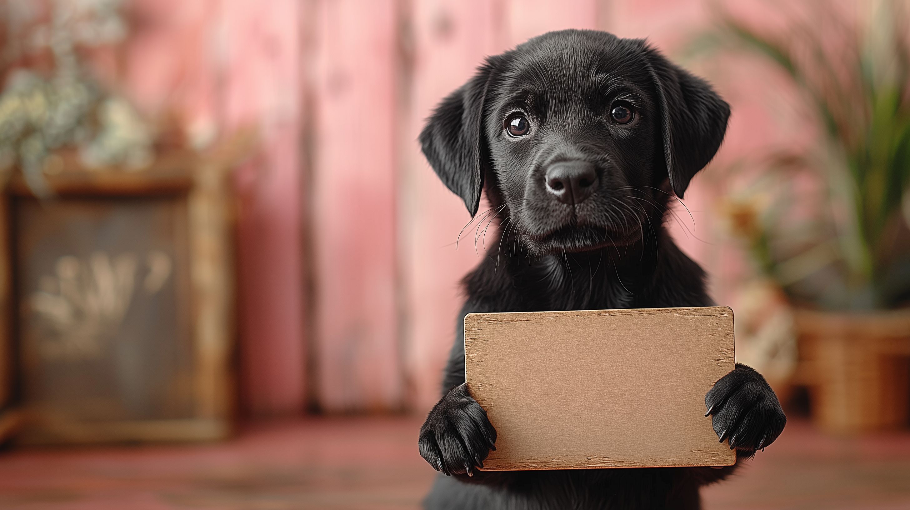 Das Foto zeigt einen süßen, schwarzen Labrador-Welpen, der in die Kamera blickt und ein leeres Pappschild in seinen Pfoten hält. Der Hintergrund ist mit einem roten, rustikalen Holzboden und einer rosa Wand versehen, was dem Bild einen warmen und gemütlichen Charakter verleiht. Das hochauflösende Foto eignet sich ideal für die Verwendung in Blogs, Newslettern, Social-Media-Beiträgen oder Werbematerialien. Es steht unter einer Creative-Commons-Lizenz zur kostenlosen Nutzung zur Verfügung.
