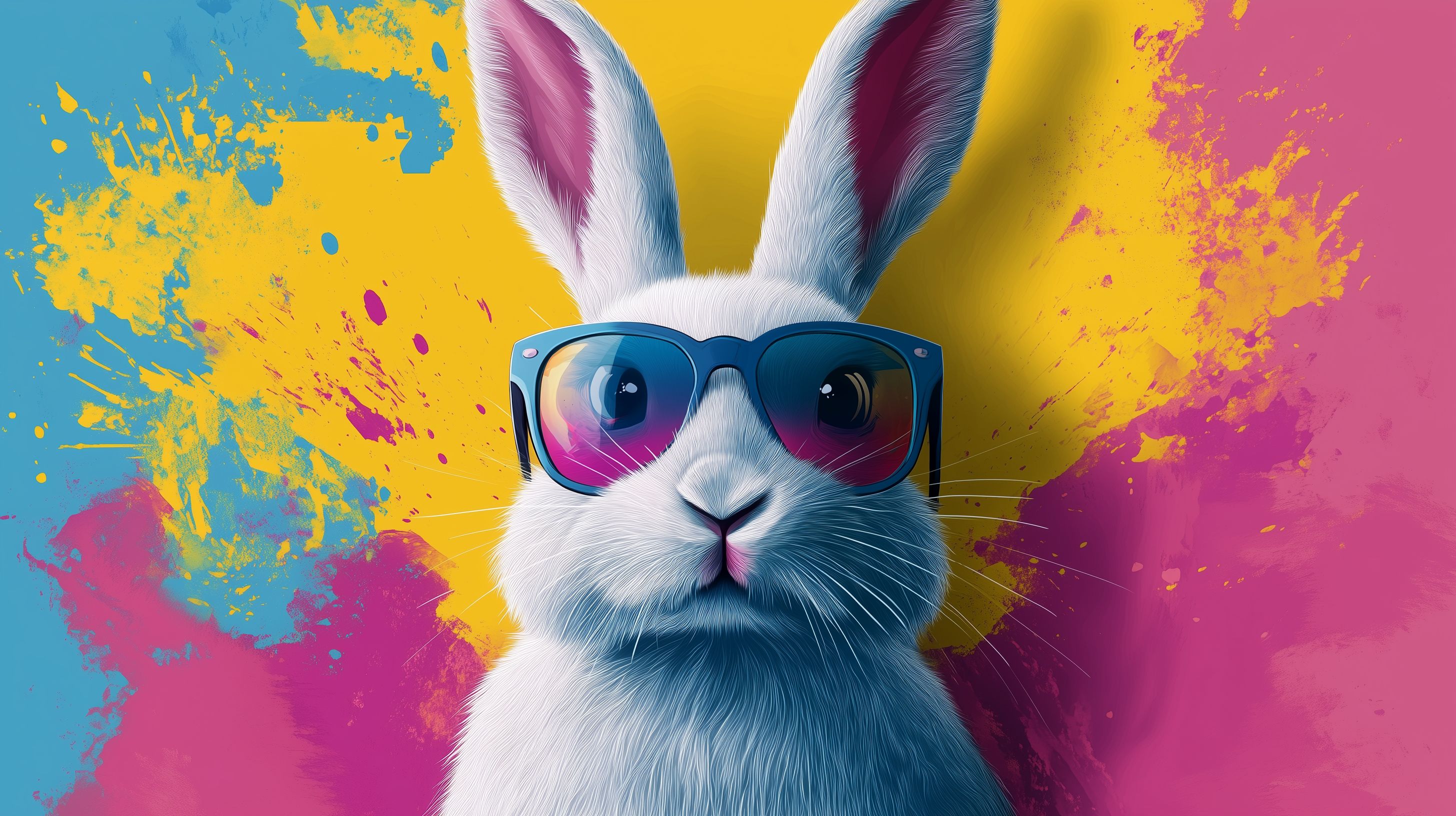 Das Bild zeigt ein Porträt eines weißen Kaninchens, das eine große, bunte Sonnenbrille trägt. Der Hintergrund ist in leuchtenden Farben wie Gelb, Blau und Pink gestaltet, die an eine Farbexplosion erinnern. Das Kaninchen blickt direkt in die Kamera, was einen niedlichen und humorvollen Eindruck vermittelt. Diese farbenfrohe Illustration eignet sich hervorragend für die Verwendung in Werbekampagnen, Grafik-Designs, Blogbeiträgen oder Social-Media-Posts, bei denen ein kreativer und verspielter Stil gefragt ist. Das hochauflösende Bild steht unter einer Creative-Commons-Lizenz zur freien Nutzung bereit.