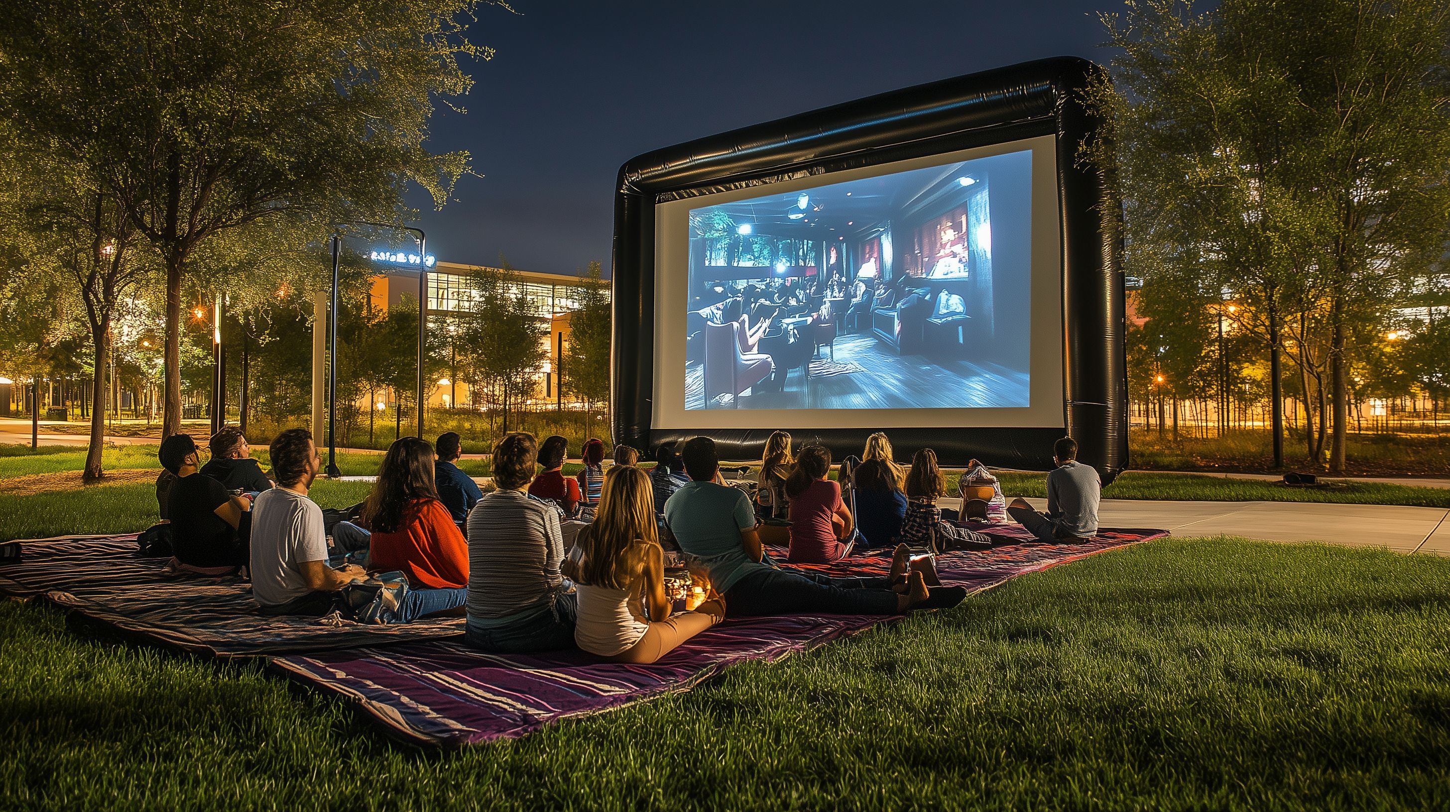 Das Bild zeigt eine stimmungsvolle Szene eines Freiluft-Kinos an einem lauen Sommerabend. In einem Park sind Zuschauer auf Decken sitzend oder liegend zu sehen, die einen Film auf einer großen Leinwand betrachten. Die Atmosphäre ist entspannt und gemeinschaftlich, beleuchtet von Straßenlaternen und dem Glow des Projektors. Dieses Stockfoto eignet sich hervorragend für Blogbeiträge, Newsletter oder Social-Media-Postings rund um Outdoor-Events, Freizeitaktivitäten und sommerliche Unterhaltungsangebote. Das hochauflösende Bild steht unter einer Creative-Commons-Lizenz zur kostenlosen Nutzung zur Verfügung.