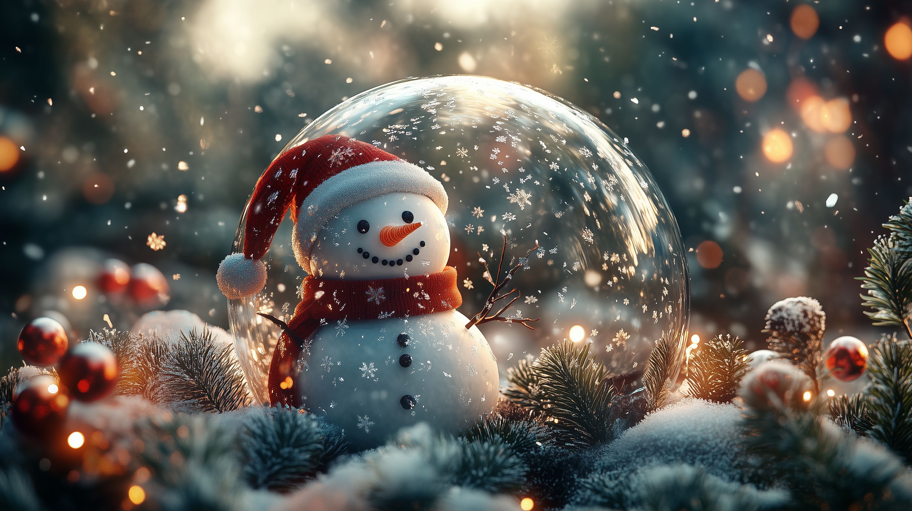 Das Foto zeigt einen fröhlichen Schneemann, der in einer Schneekugel eingeschlossen ist. Die Szene ist von winterlichen Elementen wie Tannenzweigen, Schnee und glitzernden Kristallen umgeben, die eine festliche und magische Atmosphäre schaffen. Die Tiefenschärfe und die verschwommenen Hintergründe lenken den Fokus auf den Schneemann, der mit seinem roten Schal und seinen knopfartigen Augen liebevoll gestaltet ist.