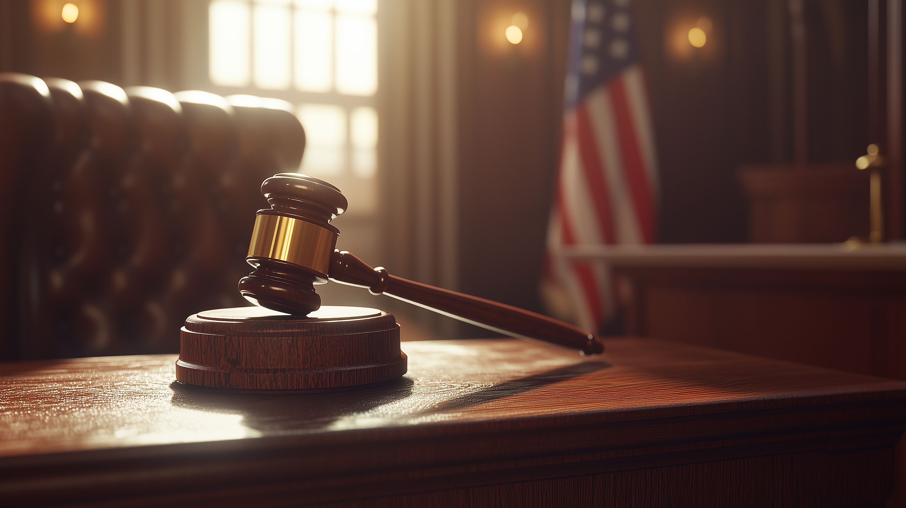 Das Bild zeigt den Hammer eines Richters, der auf einem dunklen Holztisch in einem Gerichtssaal platziert ist. Im Hintergrund ist eine amerikanische Flagge zu sehen, die auf die Autorität und den nationalen Kontext des Gerichtssystems hinweist. Die Beleuchtung ist warm und stimmungsvoll, was eine feierliche und ernsthafte Atmosphäre vermittelt. Dieses Stockfoto in hoher Auflösung eignet sich perfekt für die Verwendung in Artikeln, Blogbeiträgen oder Werbekampagnen, die sich mit Themen wie Recht, Justiz oder amerikanischer Politik befassen. Es ist unter einer Creative-Commons-Lizenz frei verfügbar.