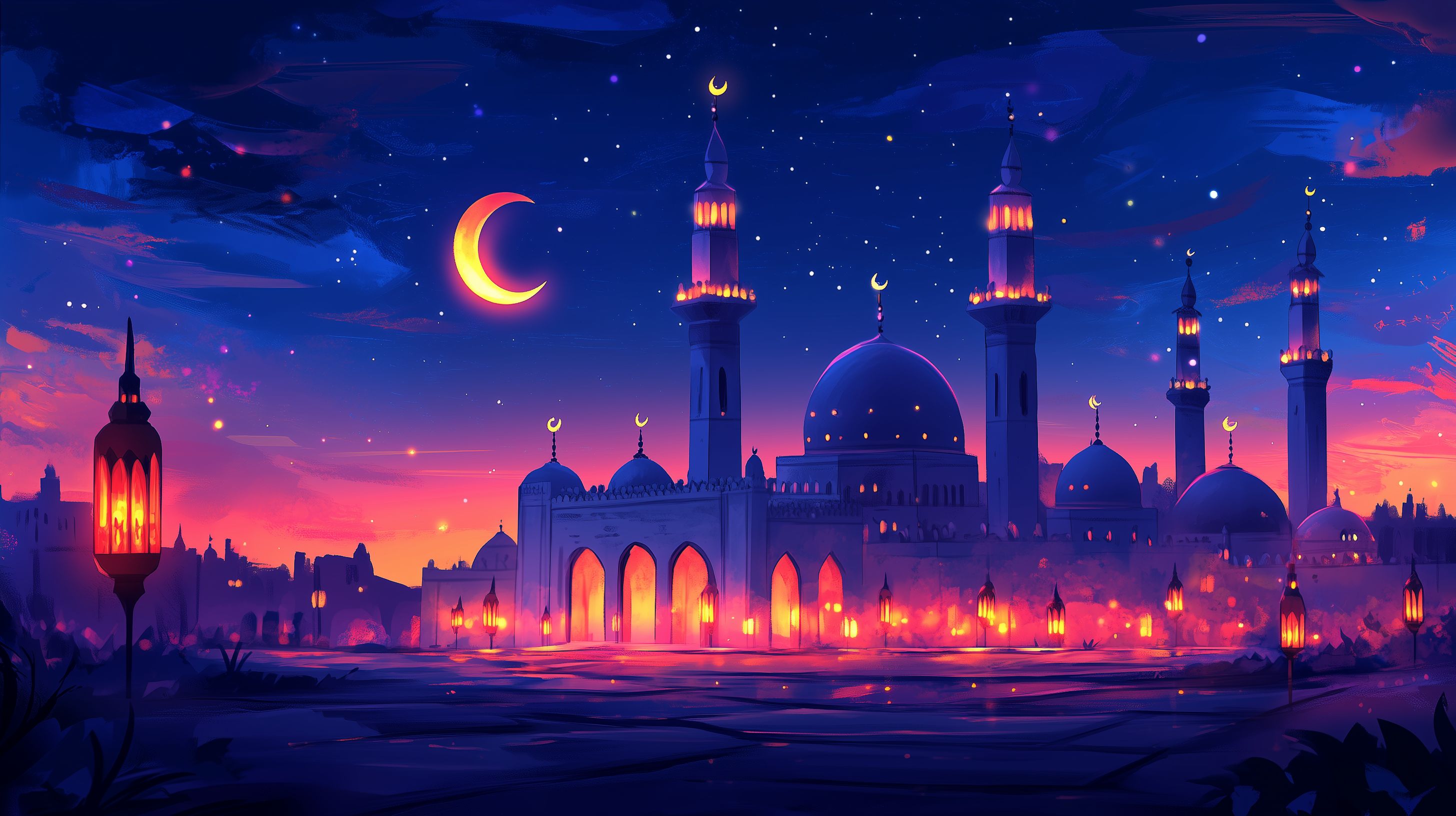 Dieses faszinierende Stockfoto zeigt eine prachtvolle Moschee-Skyline, die bei Nacht in einem warmen, mystischen Licht erstrahlt. Im Vordergrund erkennt man die markanten Kuppeln und Minarette der Moscheen, die sich vor einem tiefblauen Nachthimmel mit leuchtenden Sternen und einem zunehmenden Mond abheben. Kleine, beleuchtete Laternen tauchen die Szene in ein warmes, orientalisches Licht und verleihen dem Bild eine besonders stimmungsvolle Atmosphäre. Das Foto eignet sich hervorragend als Hintergrundbild für Blogs, Newsletter oder Social-Media-Beiträge rund um den Ramadan, den Islam oder die arabische Kultur. Dank der hochauflösenden Qualität und der Creative-Commons-Lizenz können Sie das Foto kostenfrei in Ihren Projekten verwenden.