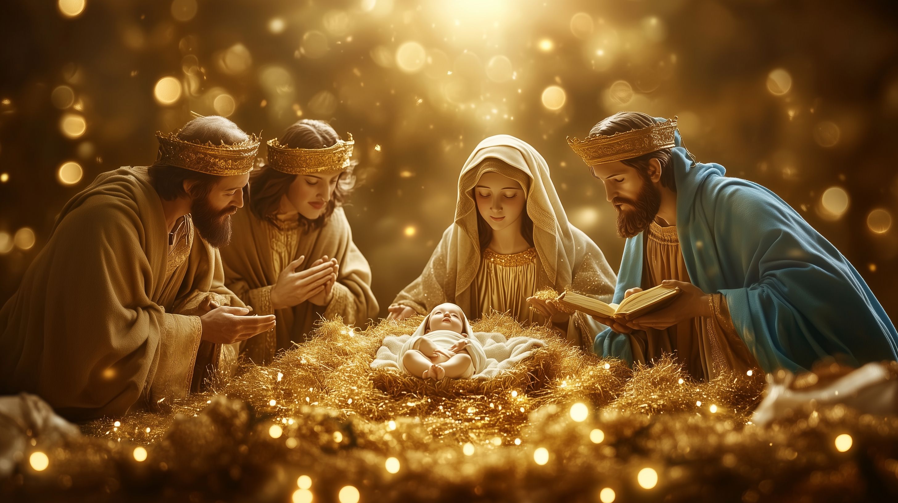 Das Bild zeigt eine romantisch inszenierte Szene aus der Weihnachtsgeschichte. Im warmen Licht einer goldenen Aura knien die heilige Maria, Josef und die Weisen aus dem Morgenland vor der Krippe, in der das neugeborene Jesuskind liegt. Das Kind scheint in einem Glanz zu leuchten, umgeben von goldenem Funkeln und Streifen. Die Figuren sind in traditionelle Gewänder gekleidet und tragen Kronen, was die Bedeutsamkeit des Moments unterstreicht. Die Komposition ist symmetrisch und verleiht der Szene eine feierliche, ehrfürchtige Stimmung.