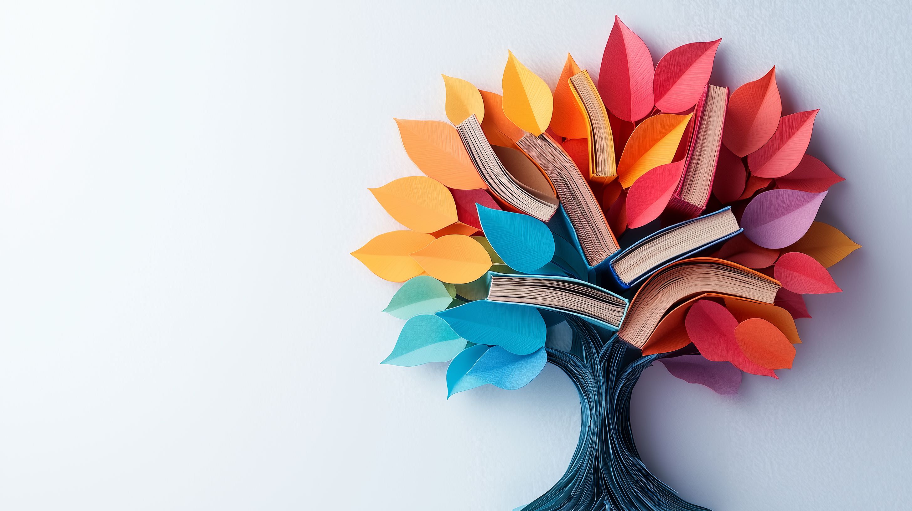 Das Foto zeigt einen kreativen, farbenfrohen Baum, der aus Buchseiten und Blättern in leuchtenden Farben wie Rot, Orange, Gelb und Türkis besteht. Der Baum steht für Bildung, Wissen und Kreativität. Die Komposition ist symmetrisch und die Blätter sind kunstvoll arrangiert, was eine ästhetische und inspirierende Wirkung erzeugt.