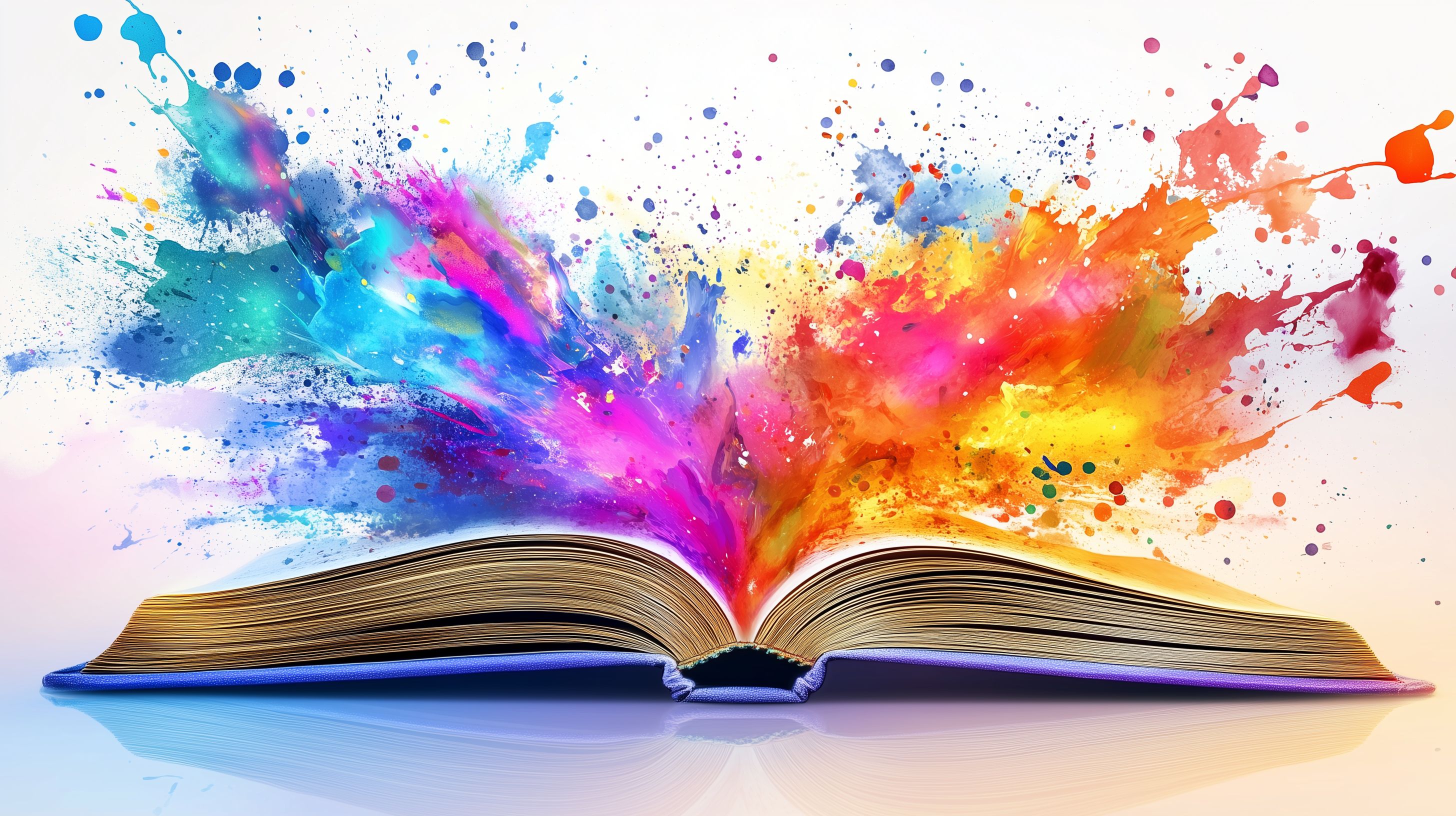 Dieses Stockfoto zeigt eine kreative und bunte Explosion von Farben, die aus einem offenen Buch hervortreten. Das Bild vermittelt eine Atmosphäre der Freiheit, Fantasie und Magie, die mit dem Lesen und der Bildung in Verbindung stehen. Die Aquarell-ähnlichen Farbspritzer in Regenbogenfarben wie Blau, Lila, Orange und Gelb verleihen dem Bild eine künstlerische und abstrakte Anmutung.