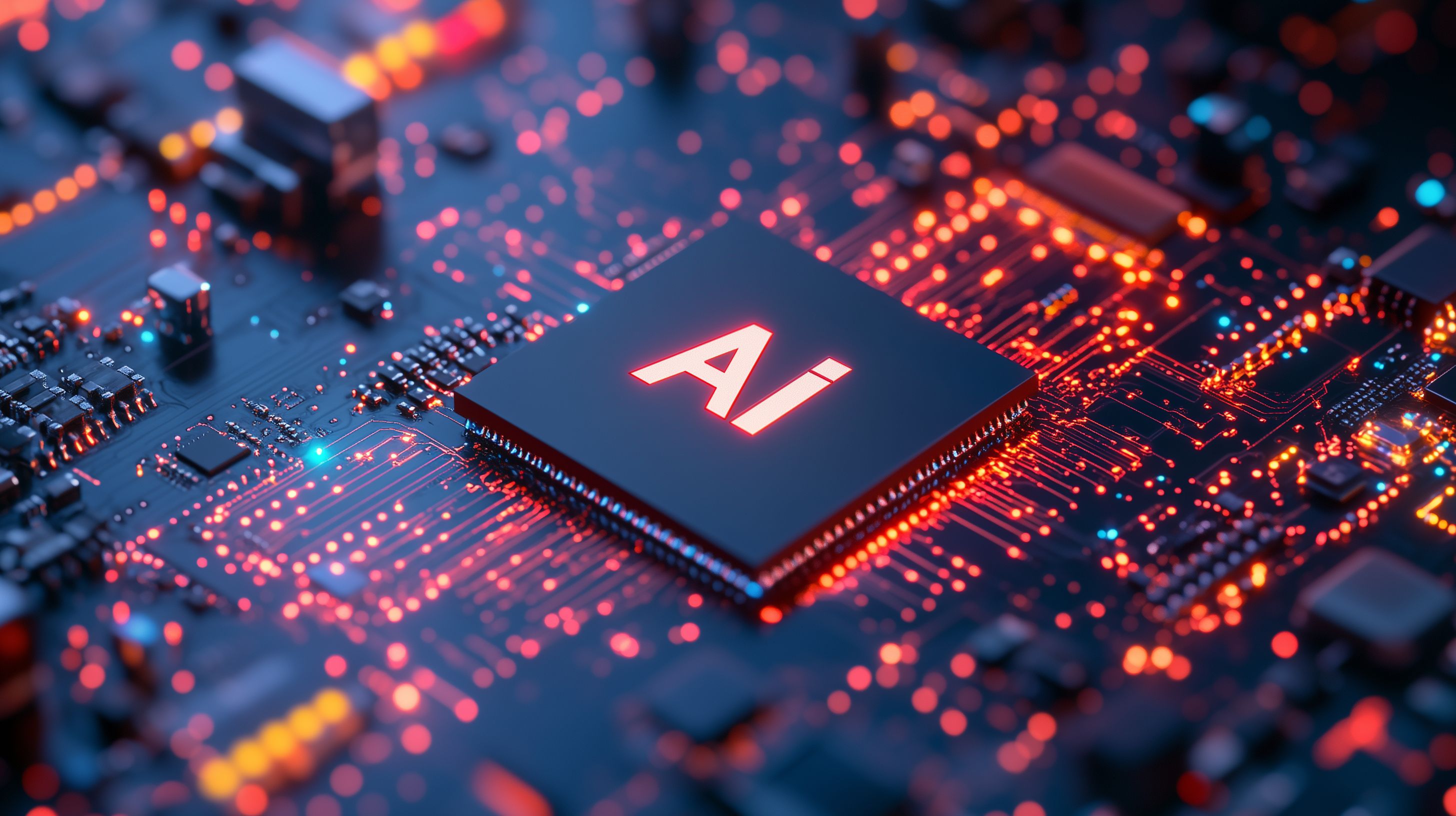 Dieses farbenfrohe Bild zeigt einen Computerchip, auf dem deutlich das Symbol für Künstliche Intelligenz (KI) erkennbar ist. Der Chip ist von einem komplexen Netzwerk aus glühenden Schaltkreisen und Leiterbahnen umgeben, die die fortschrittliche Technologie und Leistungsfähigkeit der KI-Systeme symbolisieren. Das Bild vermittelt einen futuristischen und innovativen Eindruck und eignet sich hervorragend als Hintergrundbild oder Illustrationselement für Artikel und Designs rund um das Thema Digitalisierung, Technologie und Fortschritt. Als hochwertiges, kostenloses Stockfoto in hoher Auflösung unter Creative-Commons-Lizenz ist es für vielfältige Einsatzzwecke geeignet.