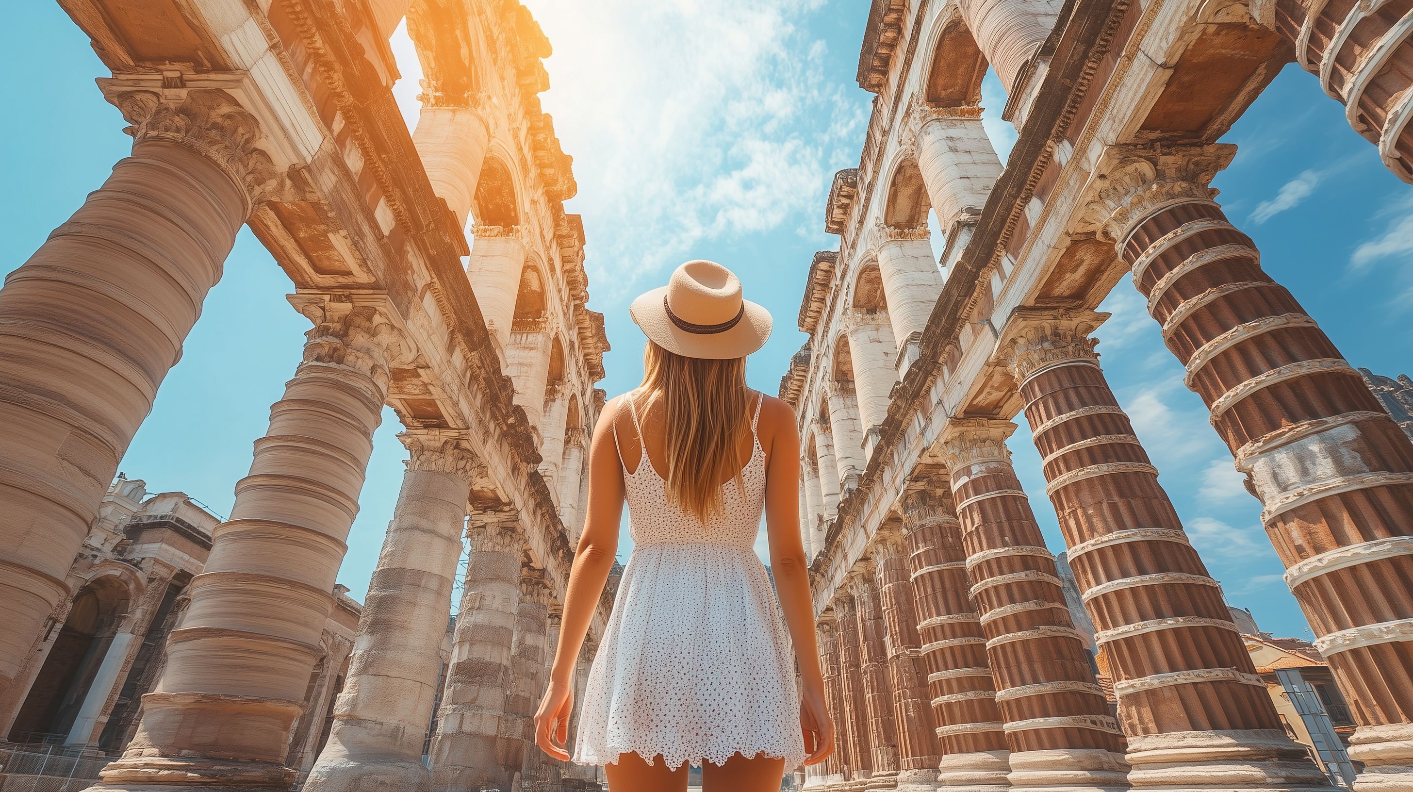 Das Foto zeigt eine junge Frau in einem weißen, bestickten Sommerkleid, die vor einer antiken Säulenhalle steht. Die Architektur der Säulen und Bogen erstreckt sich im Hintergrund, was einen mediterranen, historischen Eindruck vermittelt. Die Sonne scheint von der Seite auf die Szene, was die warme, natürliche Beleuchtung erzeugt. Die Frau trägt einen Strohhut und hat ihr Gesicht von der Kamera abgewandt, was den Blick auf die imposante Kulisse lenkt. Dieses kostenlose Stockfoto in hoher Auflösung eignet sich hervorragend für Urlaubsberichte, Reiseartikel oder Social-Media-Beiträge mit Sommerthemen.