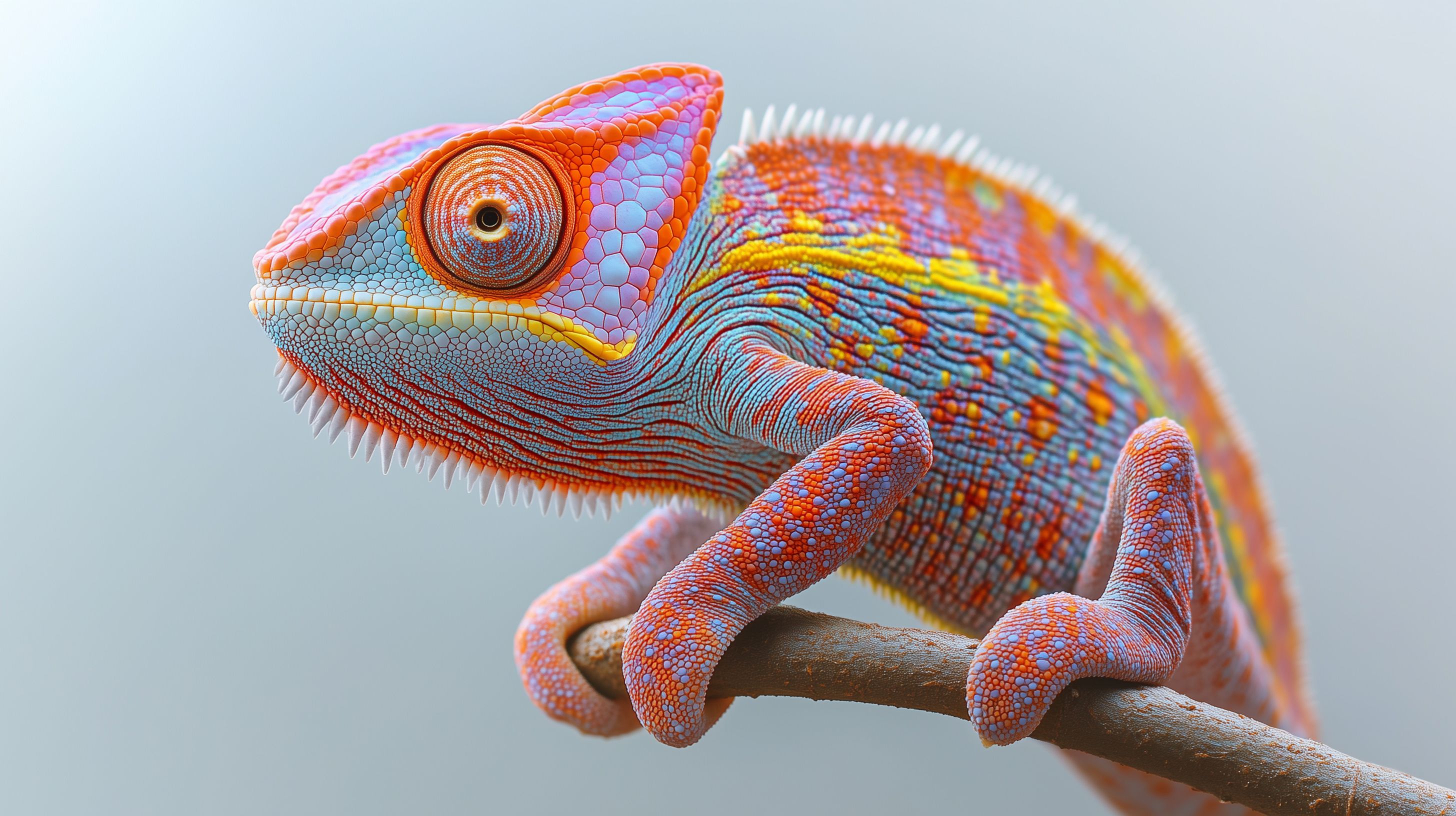 Dieses faszinierende Foto zeigt ein buntes, detailreiches Chamäleon, das auf einem Ast in Nahaufnahme abgelichtet wurde. Mit seiner beeindruckenden Farbpalette von Orange, Blau, Gelb und mehr wirkt das Reptil wie ein Kunstwerk der Natur. Die scharfe Fokussierung auf den Kopf und die Körperstruktur des Chamäleons lassen die unglaubliche Textur und Detailgenauigkeit seines Hautmusterschuppens deutlich hervortreten. Dieses Foto eignet sich hervorragend als hochwertiges, kostenloses Stockfoto für Blogs, Newsletter, Social Media-Beiträge oder Werbematerial, bei denen eine faszinierende, naturnahe Optik gefragt ist. Das Bild ist in hoher Auflösung verfügbar und unter einer Creative Commons-Lizenz frei nutzbar.