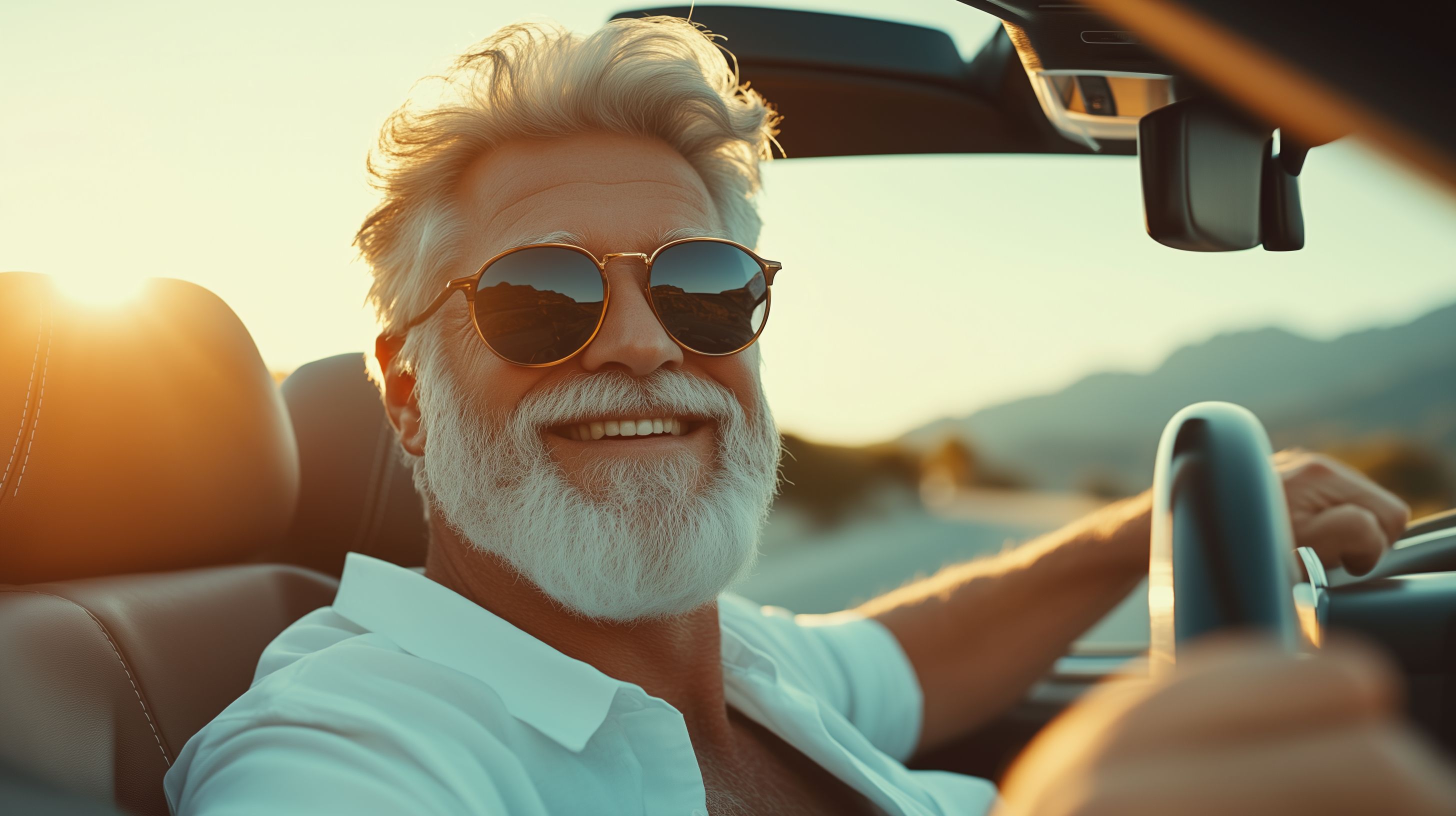 Das Foto zeigt einen glücklichen, älteren Mann, der entspannt und lächelnd in seinem Cabrio fährt, während die Sonne am Horizont untergeht. Die warmen Sonnenstrahlen und die malerische Bergkulisse im Hintergrund verleihen der Szene eine friedliche und erholsame Atmosphäre. Dieser Moment der Freude und Unbeschwertheit im Ruhestand kann perfekt als kostenloses Stockfoto für verschiedene Zwecke wie Blogbeiträge, Social Media-Posts oder Werbekampagnen rund um Themen wie Reisen, Lifestyle, Wohlbefinden oder das Rentnerdasein eingesetzt werden. Das hochauflösende Bild steht unter einer Creative-Commons-Lizenz zur Verfügung.