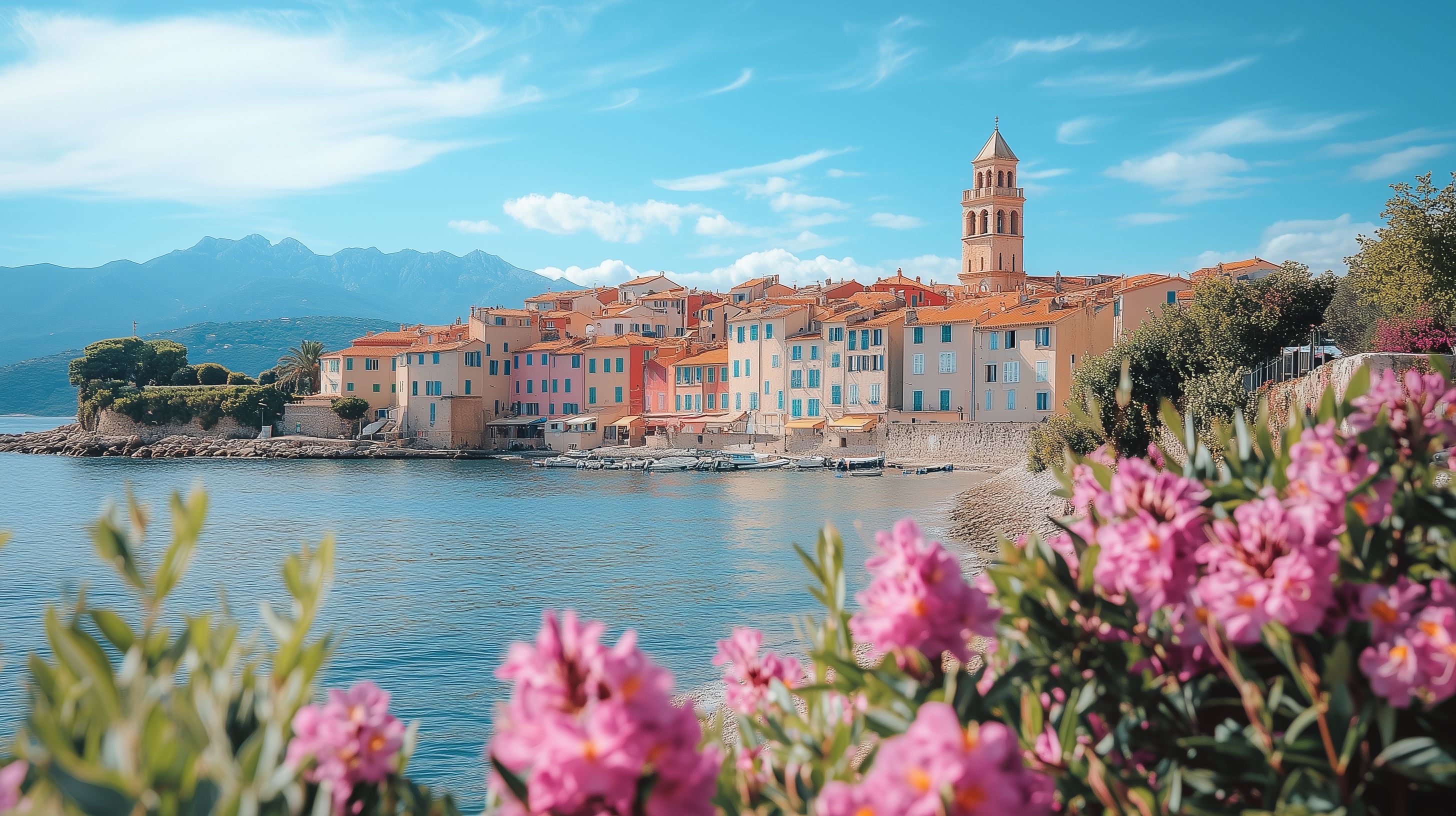 Das Foto zeigt eine malerische Küstenstadt an der französischen Riviera. Im Vordergrund sind bunte, pastellfarbene Häuser zu sehen, die sich an der Küste entlangschmiegen. Im Hintergrund ragen eindrucksvolle Berge empor, vor denen sich ein klarer, blauer Himmel mit vereinzelten Wolken erstreckt. Das Meer im Vordergrund schimmert in verschiedenen Blautönen und lädt zum Verweilen ein. Üppige, rosa blühende Blumen rahmen die Szene. Insgesamt vermittelt das Bild eine romantische, mediterrane Atmosphäre und weckt Sehnsüchte nach einer Reise an die Côte d'Azur. Dieses hochauflösende Stockfoto unter Creative-Commons-Lizenz kann perfekt für Blogs, Newsletter, Social-Media-Posts oder Werbematerialien rund um Reisen, Tourismus oder Architektur genutzt werden.