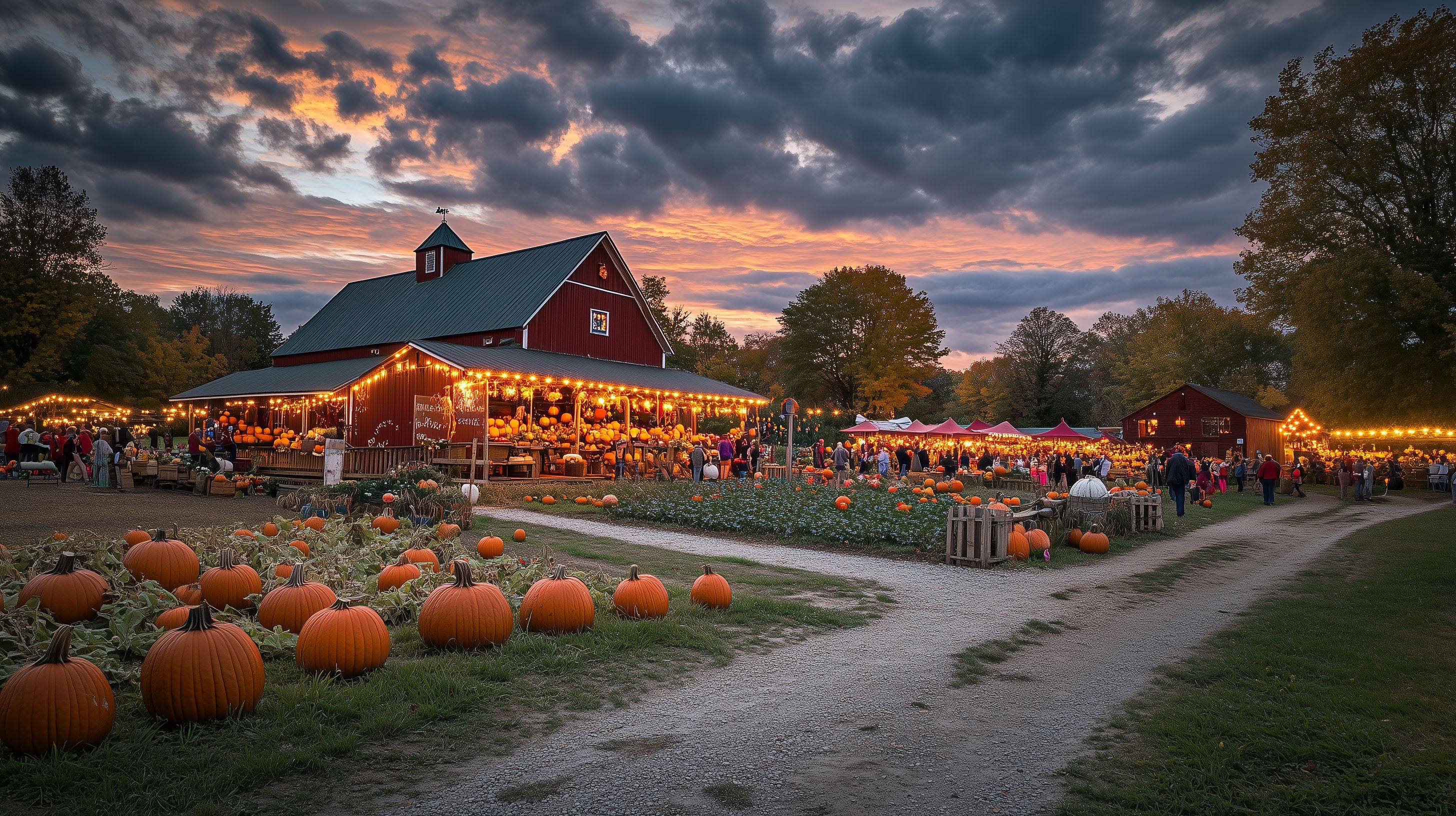 Dieses stimmungsvolle Foto zeigt einen idyllischen Bauernhof-Markt bei Sonnenuntergang. Im Vordergrund sind zahlreiche dekorativ arrangierte Kürbisse zu sehen, während im Hintergrund eine bunte Szenerie aus beleuchteten Ständen, Zelten und einem traditionellen Holzschuppen erkennbar ist. Die warmen Farben des Sonnenuntergangs tauchen die gesamte Szene in ein malerisches Licht und verleihen dem Bild eine gemütliche, ländliche Atmosphäre. Dieses Foto eignet sich hervorragend als kostenfreies Stockfoto für Blogbeiträge, Newslettergestaltung, Werbematerial oder Social-Media-Posts rund um Erntedank, Herbst oder ländliche Themen. Es ist in hoher Auflösung und unter einer Creative-Commons-Lizenz verfügbar.