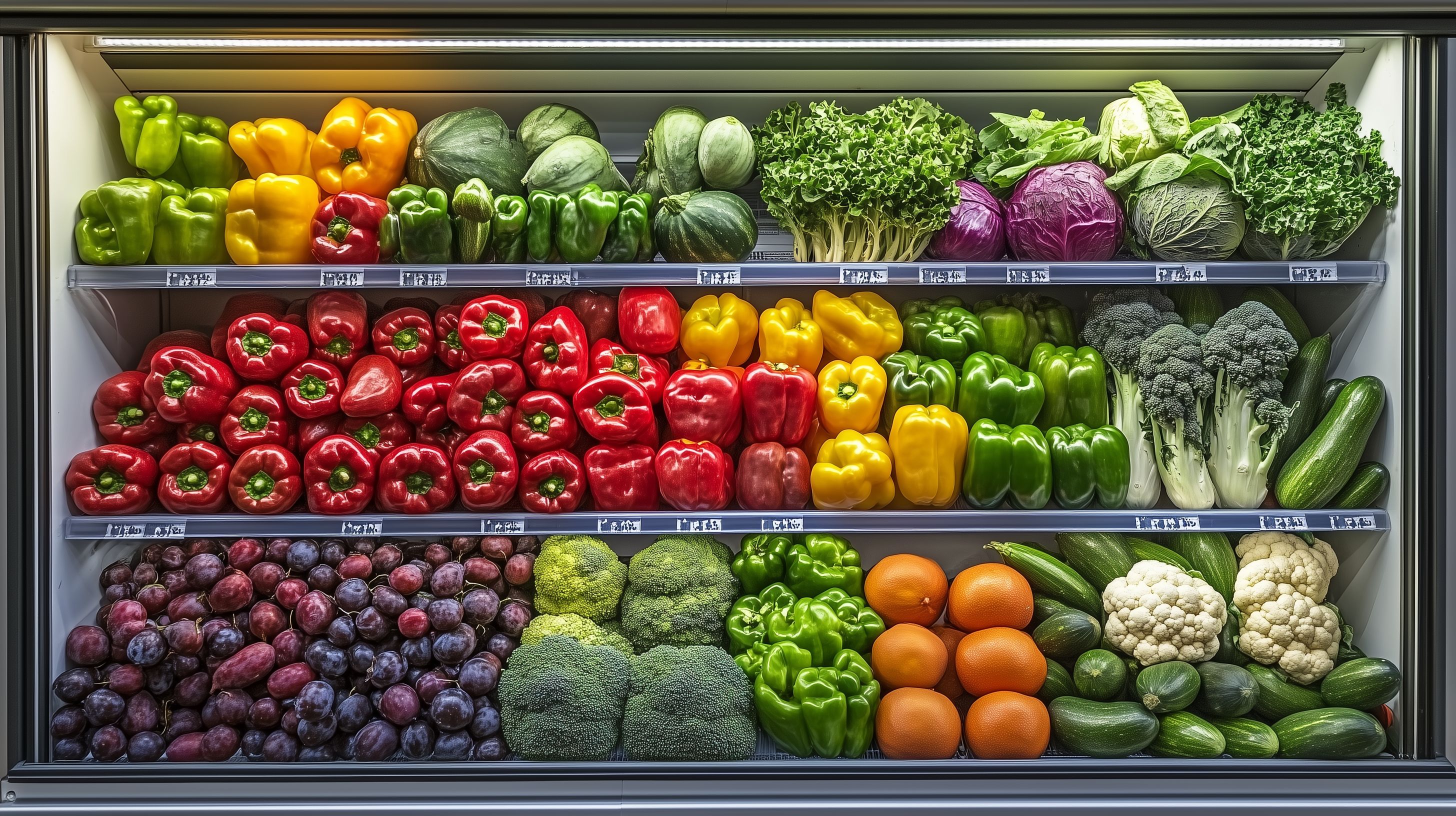 Dieses Foto zeigt eine bunte Auswahl an frischem Gemüse, das in einem modernen Kühlschrankfach angeordnet ist. Die Lebensmittel sind sorgfältig nach Farben und Formen gruppiert, was eine ästhetische und appetitliche Präsentation ergibt. Das Arrangement umfasst verschiedene Paprikasorten, Tomaten, Zucchini, Auberginen, Brokkoli, Kräuter und weitere Gemüsearten. Die Beleuchtung und Schärfentiefe lassen die Produkte klar und detailliert hervortreten. Dieses vielseitige, hochauflösende Stockfoto eignet sich hervorragend für den Einsatz in Blogs, Newslettern, Social-Media-Beiträgen oder Werbematerialien zum Thema gesunde Ernährung, Kochen und Lebensmittel. Es ist unter einer Creative-Commons-Lizenz frei nutzbar.