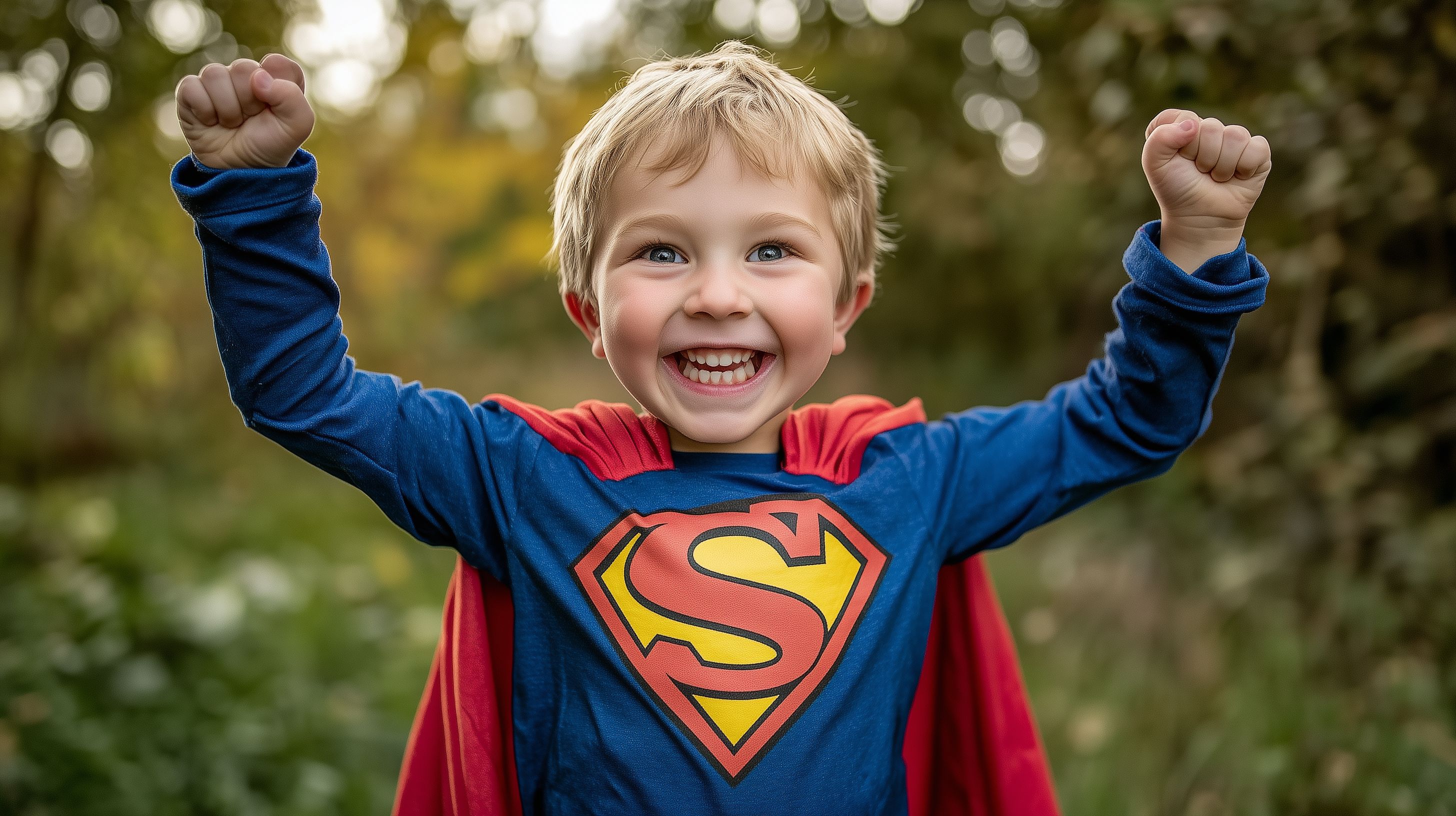 Das Bild zeigt einen fröhlichen, blonden Jungen in einem Superhelden-Kostüm, der mit erhobenen Armen und strahlendem Gesichtsausdruck in einer herbstlichen, natürlichen Umgebung steht. Die kräftigen Blau- und Rottöne des Kostüms erzeugen einen dynamischen Kontrast zur warmen, unscharfen Kulisse aus Blättern und Ästen. Das Foto vermittelt ein Gefühl von Freude, Stolz und kindlicher Fantasie. Es eignet sich hervorragend für die Verwendung in Blogs, Newslettern oder Werbeanzeigen, etwa für Produkte oder Dienstleistungen, die Kinder und Familie, Abenteuer und Kreativität ansprechen. Dieses hochauflösende, kostenlose Stockfoto steht unter einer Creative-Commons-Lizenz zur Verfügung.