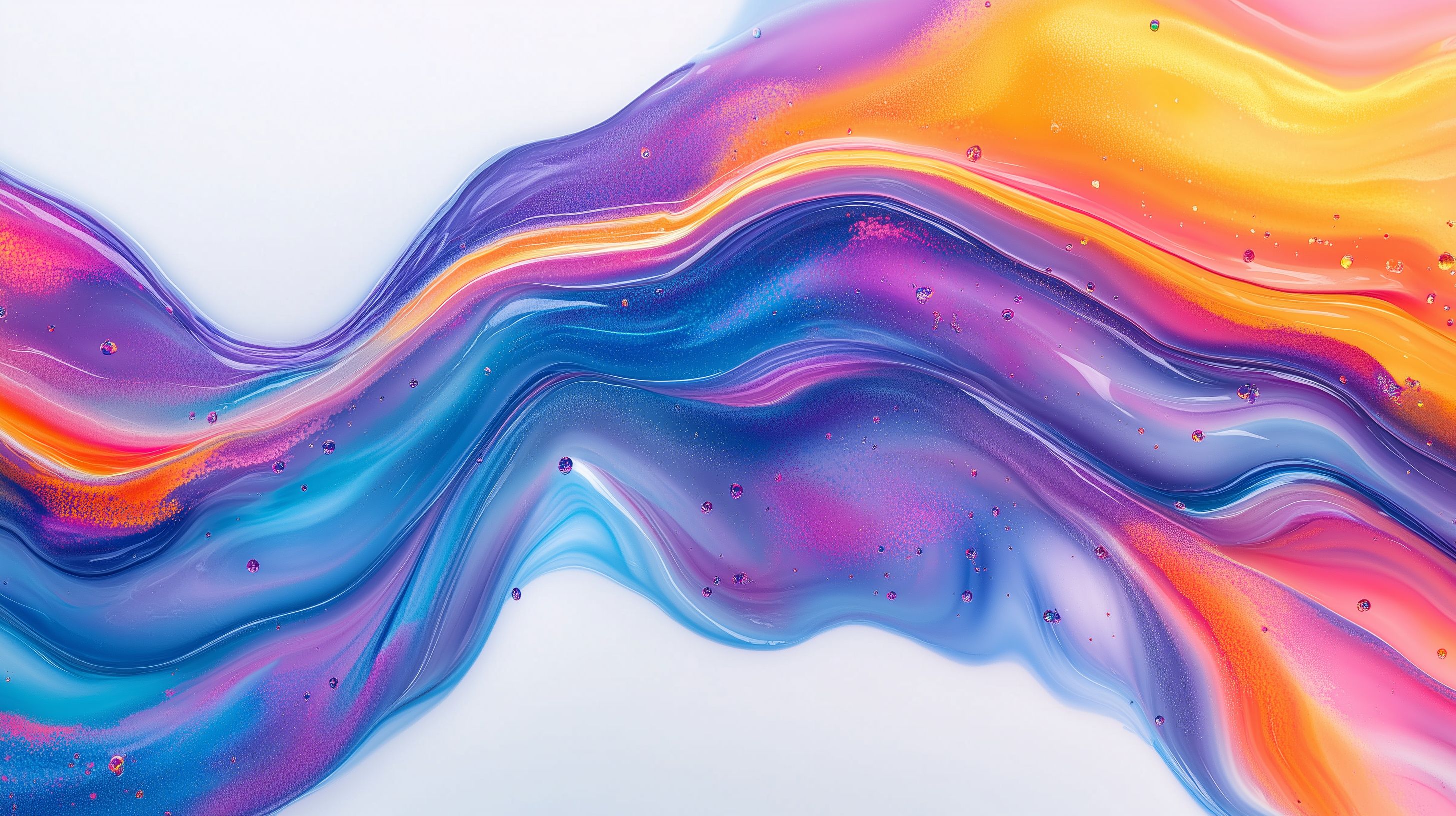 Dieses beeindruckende Bild zeigt eine farbenfrohe, dynamische Flüssigkeitsbewegung in kräftigen, leuchtenden Farbtönen. Die organisch geschwungenen, wellenförmigen Strukturen in Blautönen, Violett, Orange und Gelb erschaffen ein grafisch-abstraktes Muster voller Energie und Lebendigkeit. Die Komposition ist ausgewogen und strukturiert, wodurch das Motiv besonders stimmungsvoll und ästhetisch wirkt.